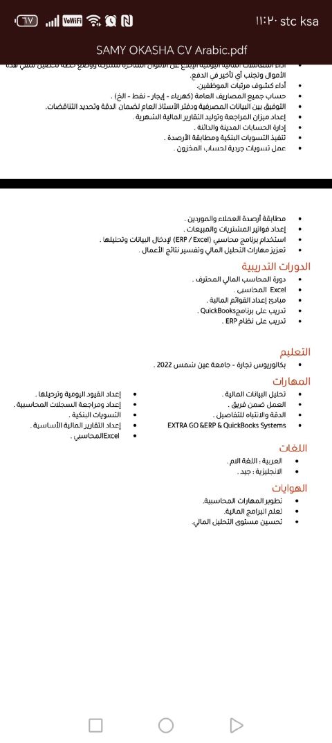 محاسب مصري خبرة سنتين خريج تجارة عين شمس لدي خبرة في اعداد القوائم المالية وميزان المراجعة وحساب الضريبة وتسجيل القيود اليومية والأقفال ومطابقة حساب البنك والعملاء والموردين والخزينة وتسويات العهد ولدي مهارات العمل على برامج ERB أودو كويك بوكس واكسترا جو والأكسيل