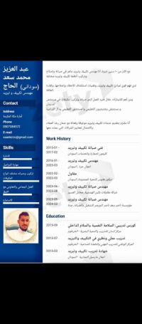خبرة 12 سنة في المجال سوداني فني تكيف وتبريد ومقاول في التأسيس والتركيب والصيانة اجهزة التكيف سبليت دولاب بكج كونسيلد VRF وأحب التطوير في المجال وقل ربي زدنا علما إقامة سارية قابل لي النقل ورخصة قيادة سارية أحب العمل معا فريق متكامل وجاهز ويحب التطوير في المجال. في الرياض موجود