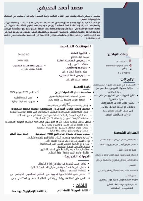 محاسب مالي - خبرة سنة محاسب حاصل على بكالوريوس تجارة (محاسبة) خبرة سنة في القيود اليومية، التقارير المالية، العملاء والموردين، وضريبة القيمة المضافة. أجيد استخدام البرامج المحاسبية وExcel