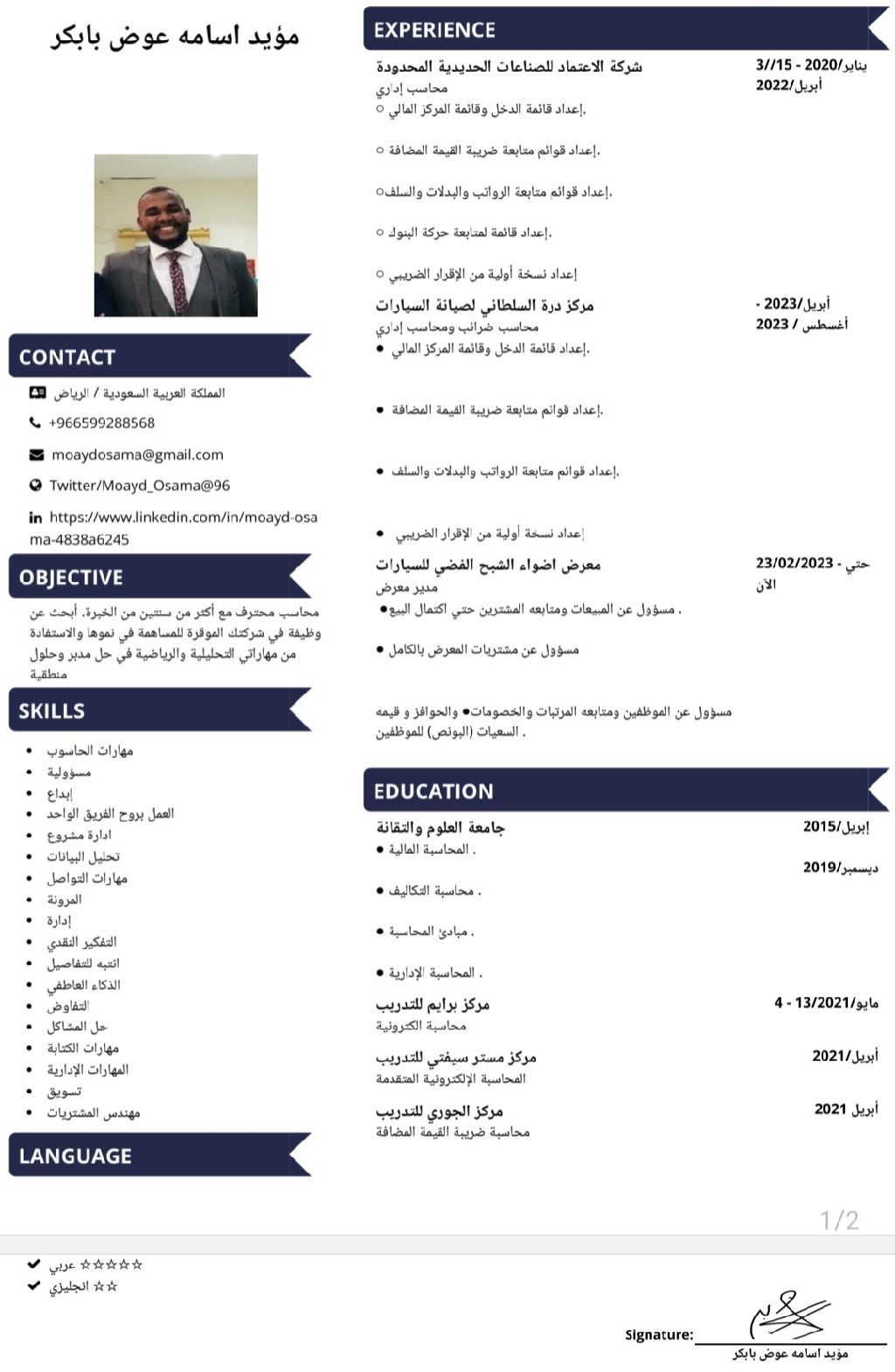 حاصل على درجة البكالوريوس من كلية المحاسبة والعلوم الادارية الخبرات العملية سنتين حاصل على شهادة في المحاسبة الالكترونية المتقدمة حاصل على شهادة في المحاسبة الالكترونية حاصل علي شهادة في ضريبة القيمة المضافة VAT التنظيم والتخطيط واعداد القوائم المالية واعداد قوائم لمتابعة VAT بدقة واعداد قوائم لمتابعة المرتبات والخصومات والسلفيات خبرة في مجال المبيعات، رخصة قيادة سعودية + اقامة قابلة للتحويل