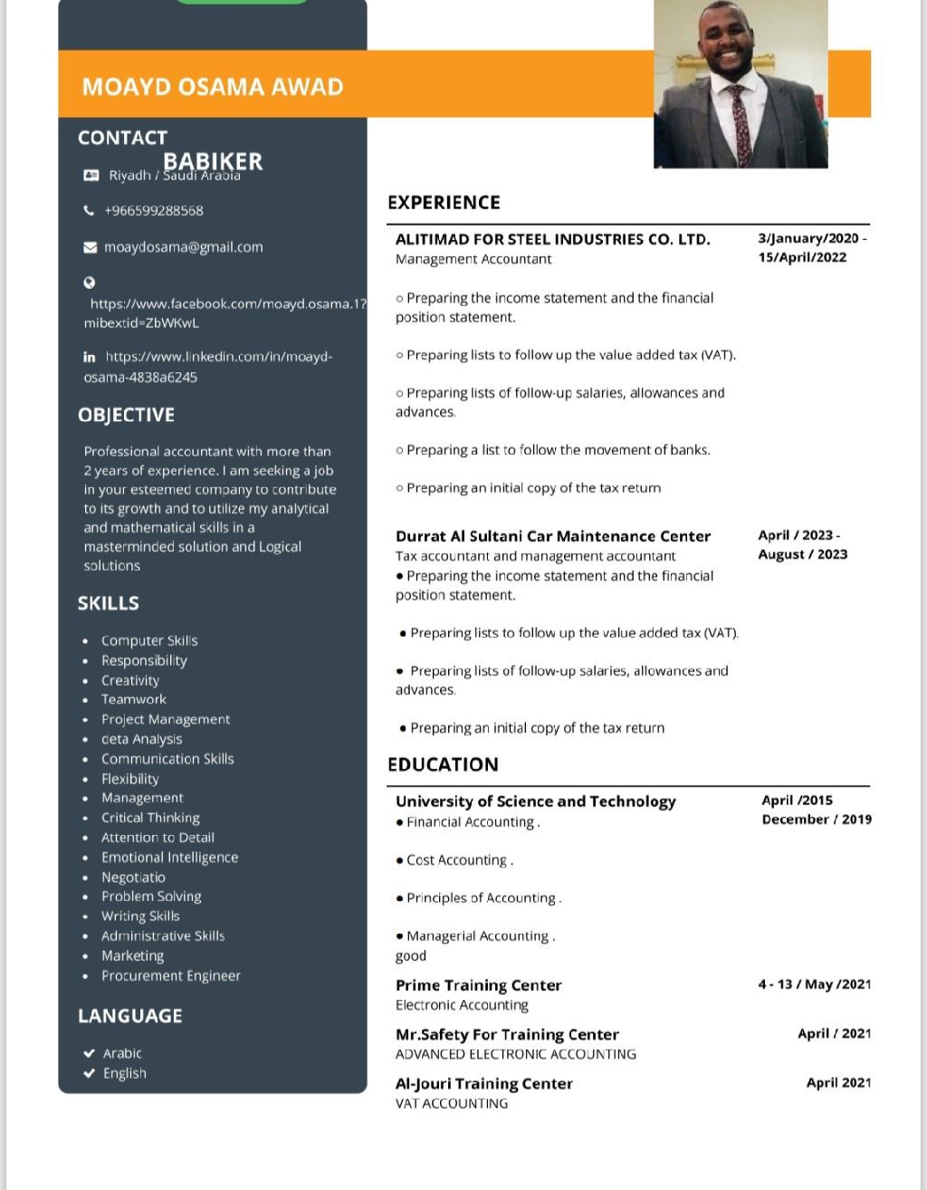 حاصل على درجة البكالوريوس من كلية المحاسبة والعلوم الادارية الخبرات العملية سنتين حاصل على شهادة في المحاسبة الالكترونية المتقدمة حاصل على شهادة في المحاسبة الالكترونية حاصل علي شهادة في ضريبة القيمة المضافة VAT التنظيم والتخطيط واعداد القوائم المالية واعداد قوائم لمتابعة VAT بدقة واعداد قوائم لمتابعة المرتبات والخصومات والسلفيات خبرة في مجال المبيعات، رخصة قيادة سعودية + اقامة قابلة للتحويل