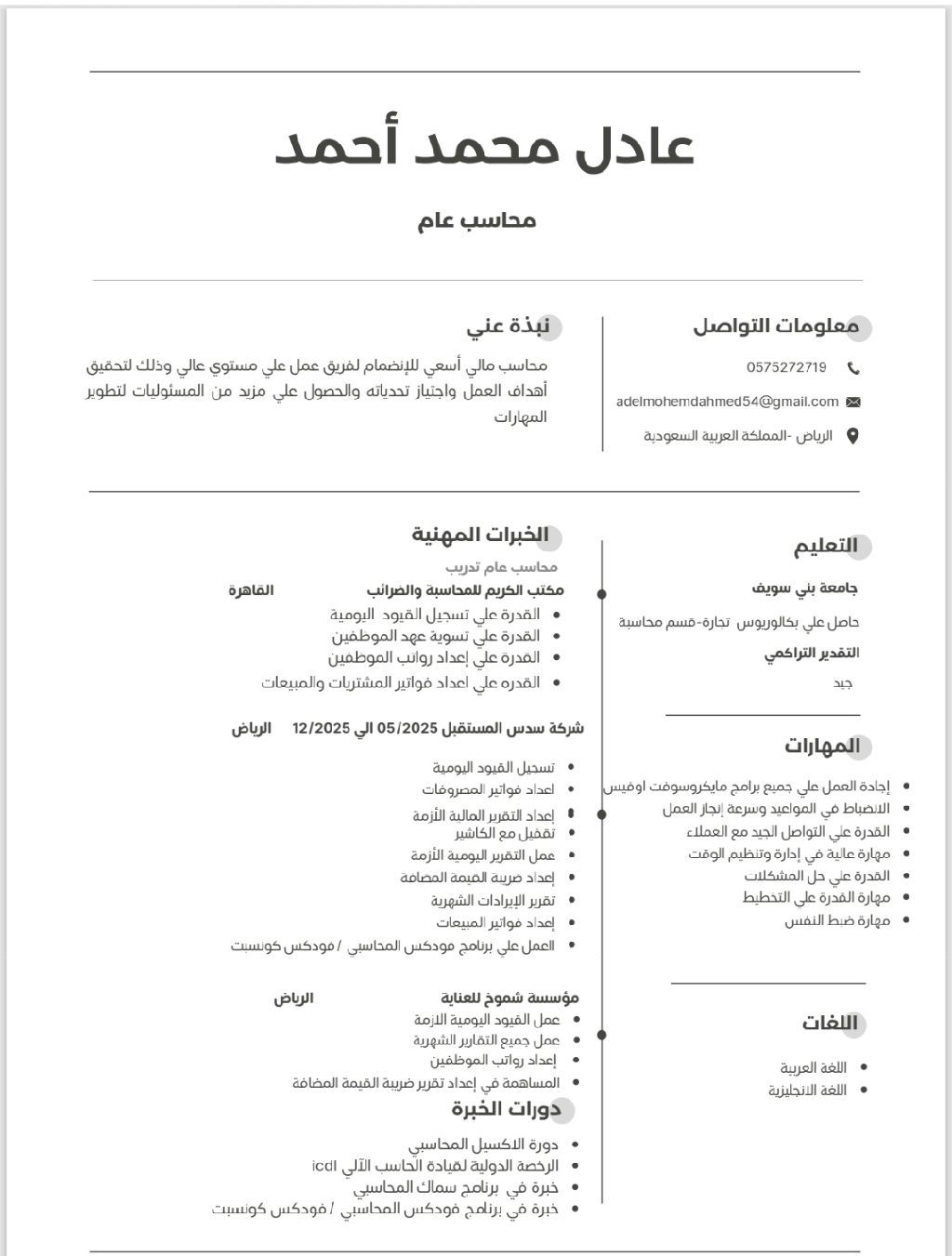 محاسب يبحث عن عمل خبرة سنة على دراية بكافة المعاملات المحاسبية وعمل قيود المبيعات والمشتريات ومتابعه العملاء والموردين والتعامل مباشر معهم وعمل التسويات ومطبقة أرصدة البنك وعمل التقرير المحاسبية خبرة على برنامج سماك وفودكس المحاسبي وفودكس كونسل وorecla وخبر ممتازة في التعامل مع برامج الأوفيس والأكسيل متواجد في الرياض وإقامة سارية قابلة للنقل وامكانية العمل في أي مكان داخل المملكة