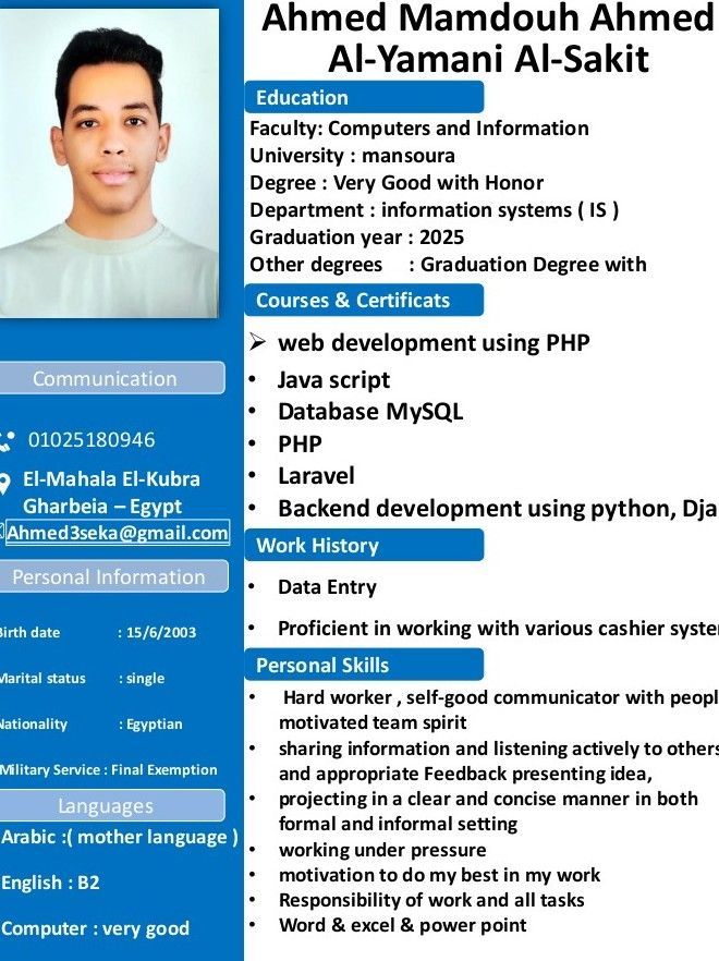 معه بكالوريوس حاسبات ومعلومات خبرة في الكمبيوتر بيعرف يتعامل علي برامج مايكروسوفت سواء word, Power Point, Excel