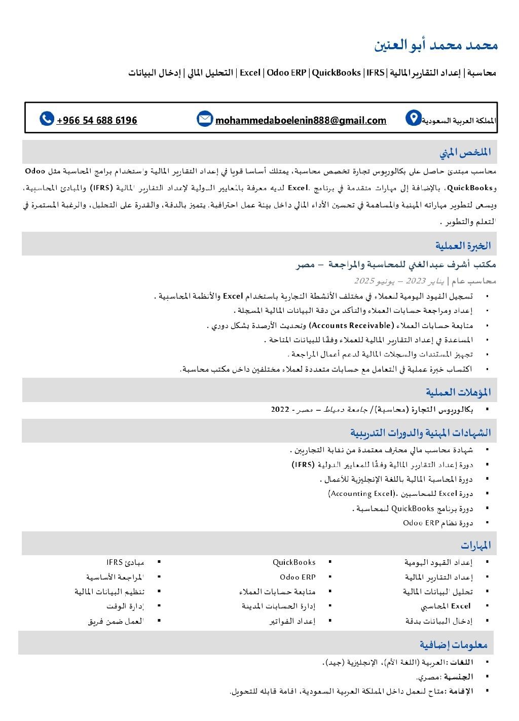 محاسب مصري ابحث عن فرصة عمل في مجال المحاسبة بكالوريوس تجارة خريج 2022 بتقدير جيد أجيد استخدام برنامج (Odoo) اسوي فاتورة مبيعات ومشتريات وكشف حساب وبرنامج (الأكسيل) اعداد الشجرة المحاسبية (اعداد القيود اليومية وترحيلها لدفتر الأستاذ وميزان المراجعة والميزانية العامة وقائمة الدخل) مقيم في الرياض (سنة خبرة) في مكتب محاسبه متدرب علي كورسات باقي 11 شهور في الإقامة