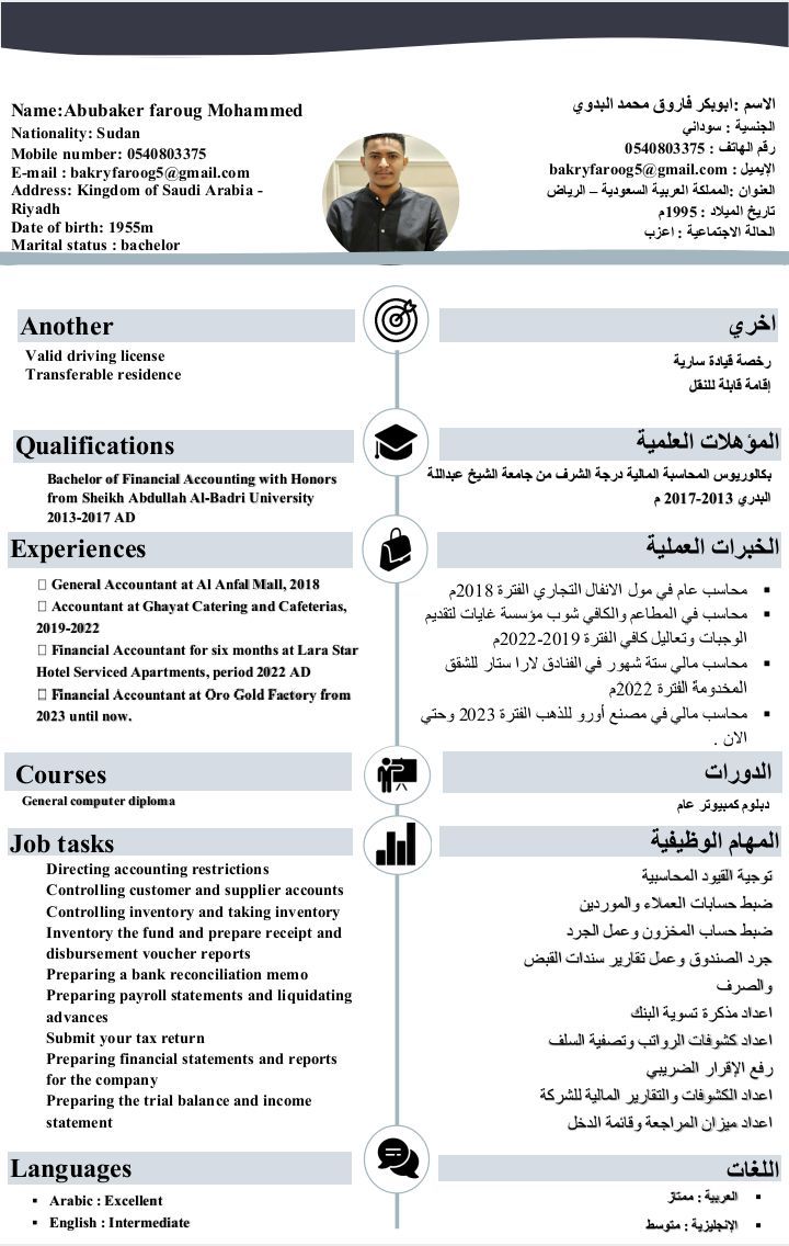 الاسم أبو بكر فاروق محمد الجنسية سوداني بكالوريوس المحاسبة العمر 31 سنة الجوال 0540803375 الخبرات العملية محاسب عام مول الأنفال من الفترة 2018 - 2019م محاسب ثلاثة من سنوات تاريخ 2020 الى 2022م مطاعم وكافي شوب تعاليل كافية ومؤسسة غايات لتقديم الوجبات محاسب ستة أشهر في الفنادق لأرا سيتي للخدمات المفروشة محاسب مالي في مجال الذهب شركة أوروا للذهب والمجوهرات من الفترة 2023 الى الآن