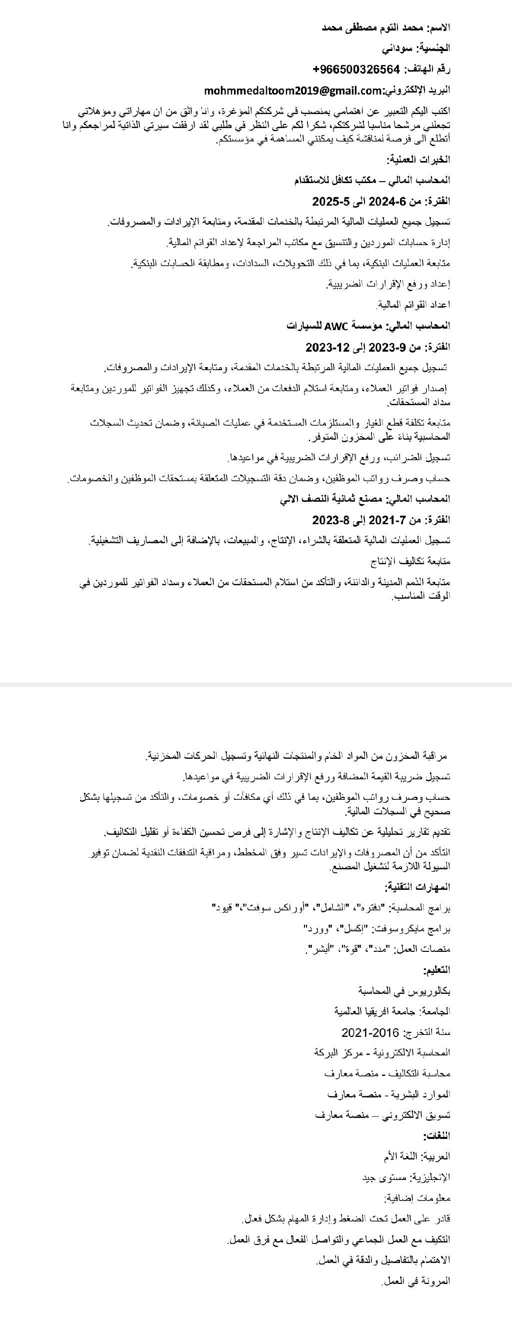 محاسب عام سوداني الجنسية 25 سنة خبرة 4 سنوات في اعداد دليل الحسابات والدورة المستندية ومراجعة كافة المستندات الصادرة والواردة والتأكد من صحتها. توثيق جميع العمليات بدقة في السجلات المحاسبية ومراجعة القيود وتدقيقها من الناحية الفنية والمحاسبية. جرد الموجودات الغير متداولة والنقدية بالصندوق وتصفية العهد المستديمة والمؤقتة وسلف الموظفين. تدقيق كشوفات حسابات البنوك وعمل التسويات البنكية اللازمة