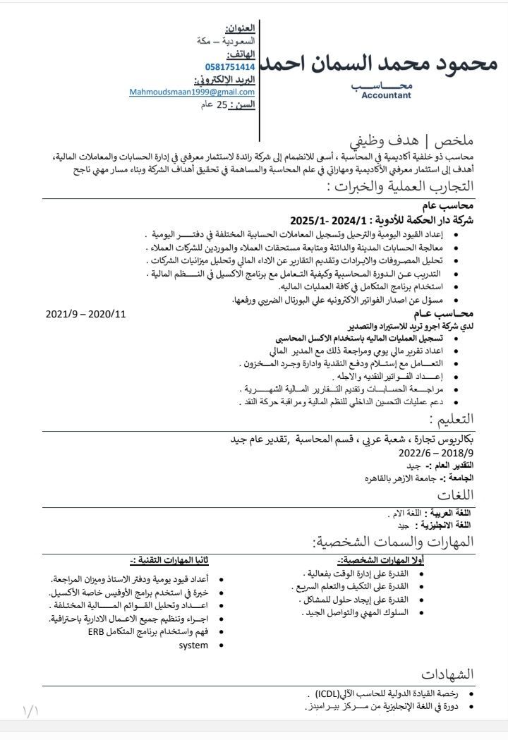 محاسب مصري خبرة من 1 - 2 سنوات موجود في السعودية خبرة في اعداد القيود اليومية وتسجيل المصروفات والايرادات وجرد المخزون