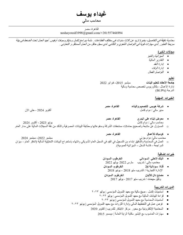 محاسبة مالية سودانية الجنسية، أتمتع بخبرة مهنية تتجاوز الثلاث سنوات في مجموعة متنوعة من القطاعات، اكتسبتها من العمل في مؤسسات رائدة في السودان ومصر، بما في ذلك الخبرة المصرفية والعمل في شركات المقاولات، قد شملت مهاية المالية، لدي اتقان كامل لبرامج Microsoft Office وExcel، وأيضا أحمل رخصة قيادة سارية المفعول