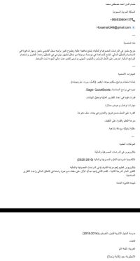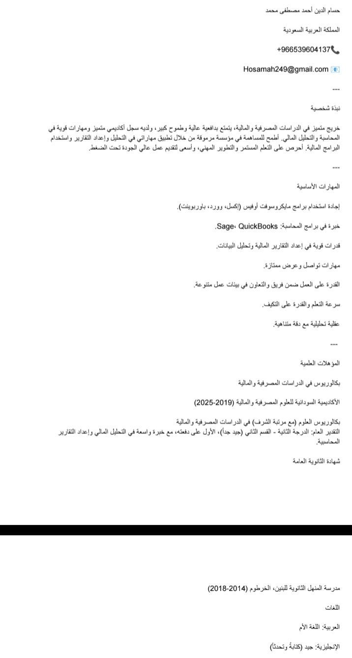 محاسب حديث تخرج - جاهز للعمل فورا محاسب حديث تخرج حاصل على بكالوريوس (شرف) في الدراسات المصرفية والمالية التقدير العام جيد جدا (Second Class - Division Two) لدي معرفة جيدة في المحاسبة المالية محاسبة التكاليف اعداد القيود اليومية الجرد والدورة المخزنية اعداد التقارير المالية أساسيات Excel وMS Office جاد ومنضبط في العمل سريع التعلم القدرة على العمل تحت الضغط الالتزام والدقة