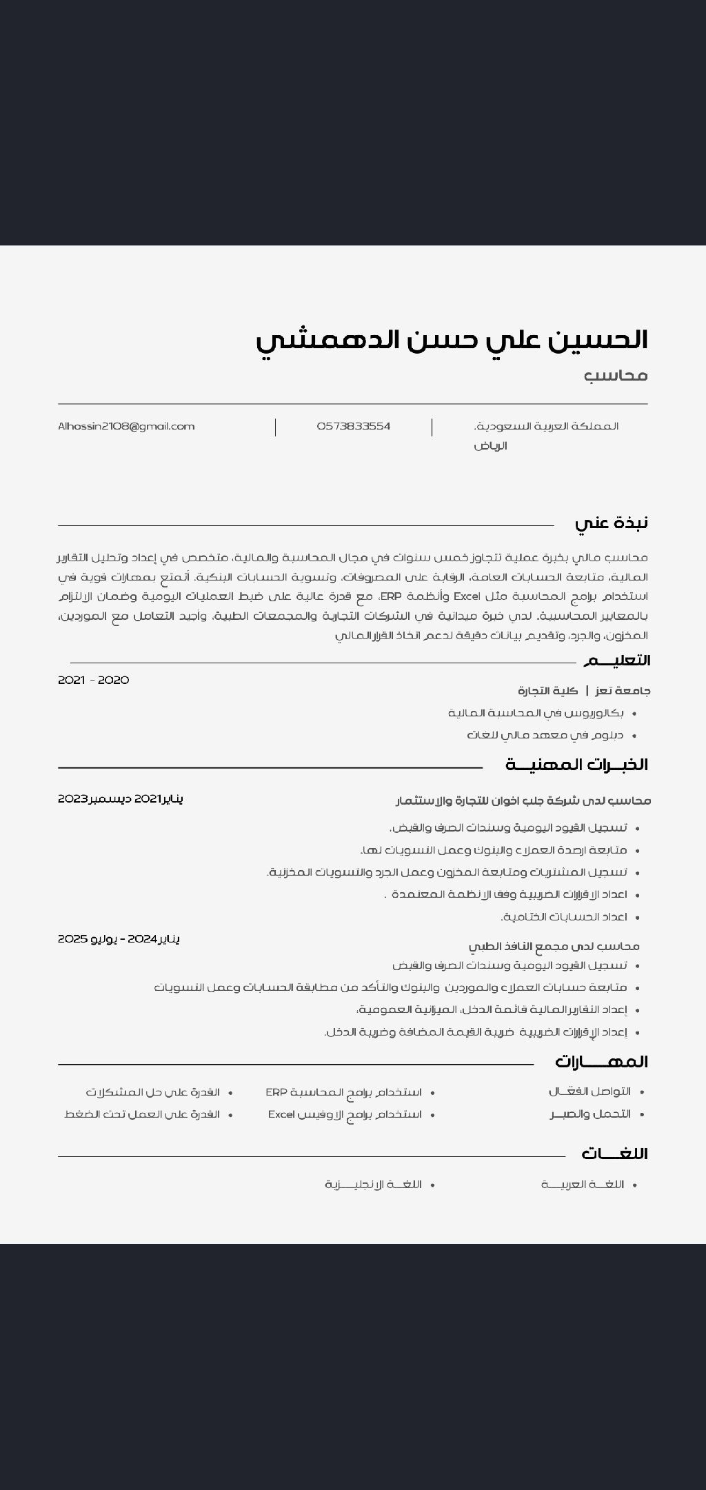 أنا الحسين علي محاسب عام بكالوريوس جامعة تعز خبرة خمس سنوات بمجال المحاسبة والكاشير أتميز بالقدرة على العمل تحت الضغط والتعامل مع العملاء بشكل راقي وأسلوب مميز واحترافي وقدرة على جذب العملاء أتمتع باللباقة وحسن الخلق