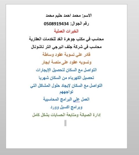 محاسب اداري مصري خبرة 4 سنين بكالوريوس تجارة انجليزي ابحث عن عمل مكتبي أو ميداني بالمواقع أو مشتريات أو مشرف فورمان أجيد العمل علي الكمبيوتر والمنصات الحكومية عملت ك محاسب مشروع ولدي رخصة قيادة
