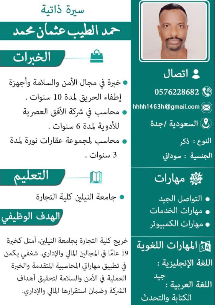 أنا محاسب سوداني الجنسية ابحث عن وظيفة لدي بكالوريوس التجارة والمحاسبة المالية لدي خبرة في المحاسبة 6 سنوات في شركة الأفق العصرية للادوية إدارة المحاسبة المالية والشهرية والسنوية وإدارة الحسابات البنكية والمصرفية ولدية خبرة في مجموعات عقارات نورة 3 سنوات وأخصائي أمن وسلامة اجهزة اطفاء الحريق 10 سنوات لمن لدية وظيفة الرجاء التواصل معي لارسال السيرة الذاتية وليس لدي مانع بالانتقال لأي منطقة اذا توفرت