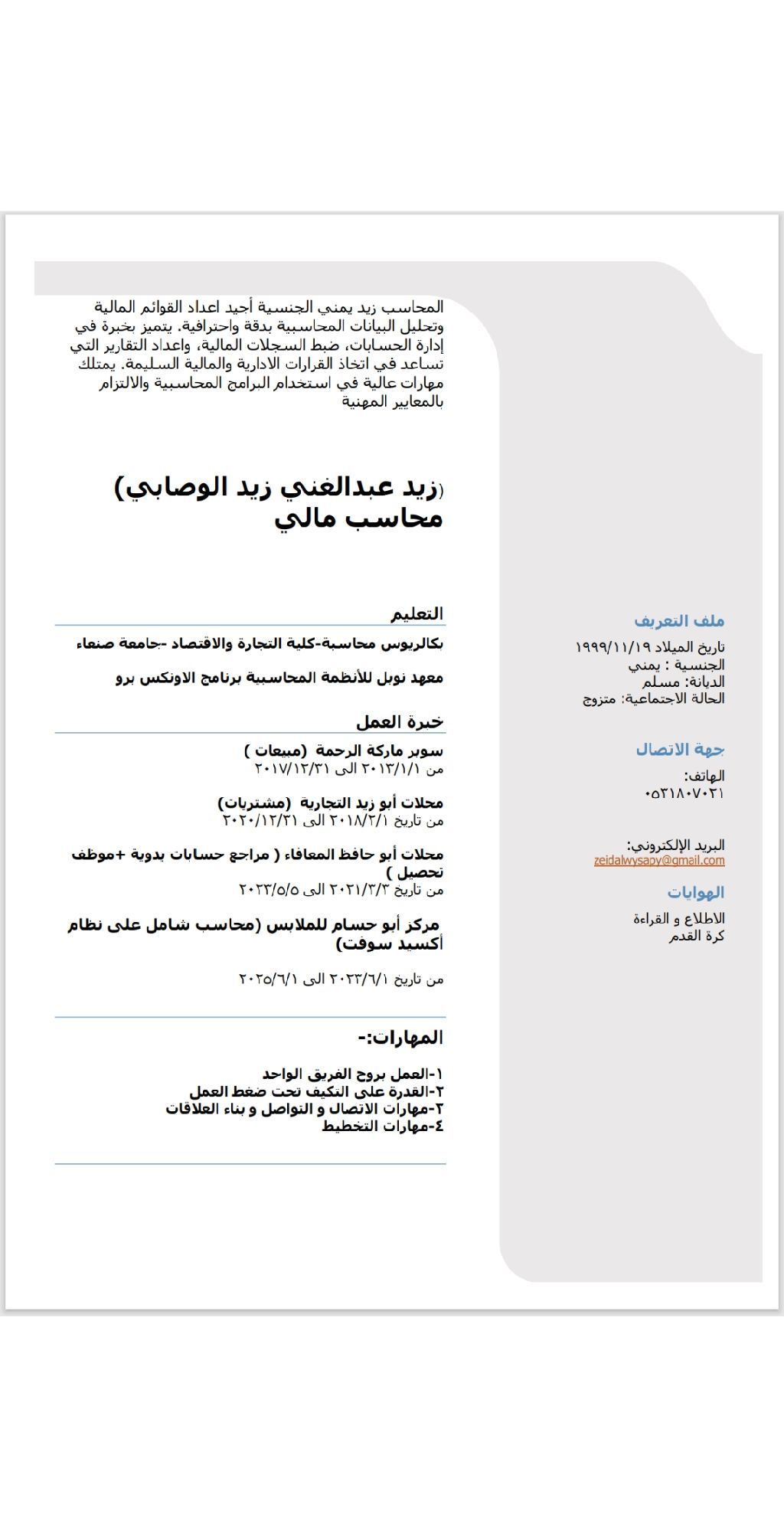 المحاسب زيد الوصابي يمني الجنسية محاسب محترف وأجيد اعداد القوائم المالية وتحليل البيانات المحاسبية بدقة واحترافية. يتميز بخبرة في إدارة الحسابات، ضبط السجلات المالية، واعداد التقارير التي تساعد في اتخاذ القرارات الادارية والمالية السليمة. يمتلك مهارات عالية في استخدام البرامج المحاسبية والالتزام بالمعايير المهنية