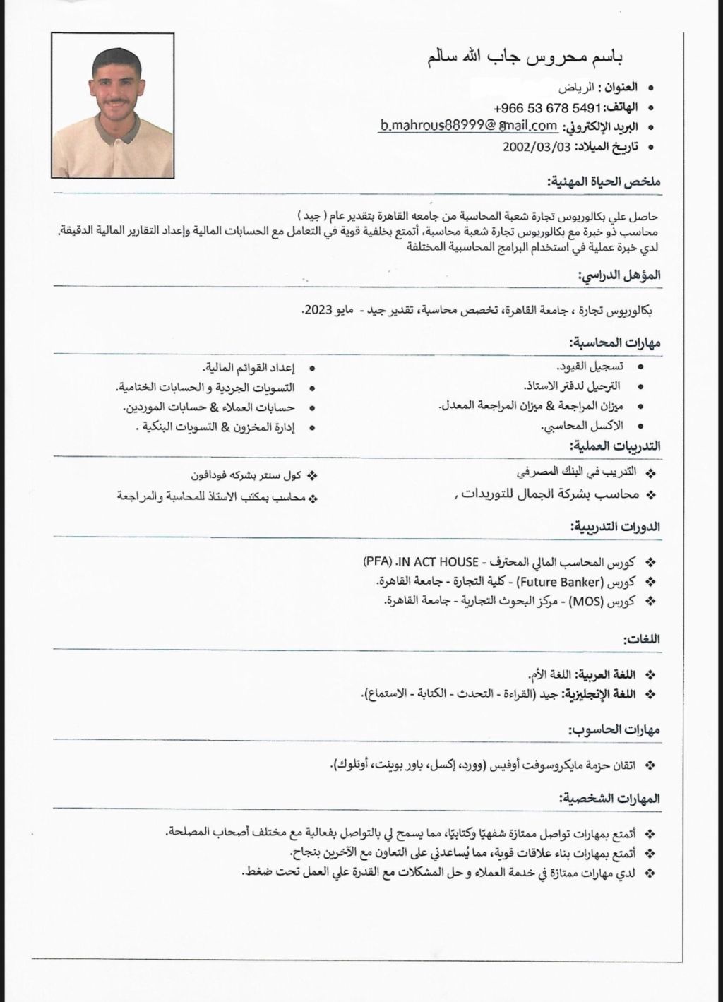 أنا محاسب مصري حديث تخرج موجود الرياض خلال الأسبوع l ابحث عن فرصة عمل وعلي أتم الاستعداد لأجراء المقابلات واثبات كفائتي ولدي القدرة علي التعامل مع البرامج المحاسبية والأوفيس وعندي خلفيه عن السوق المحاسبي ومجال الحسابات بشكل عام