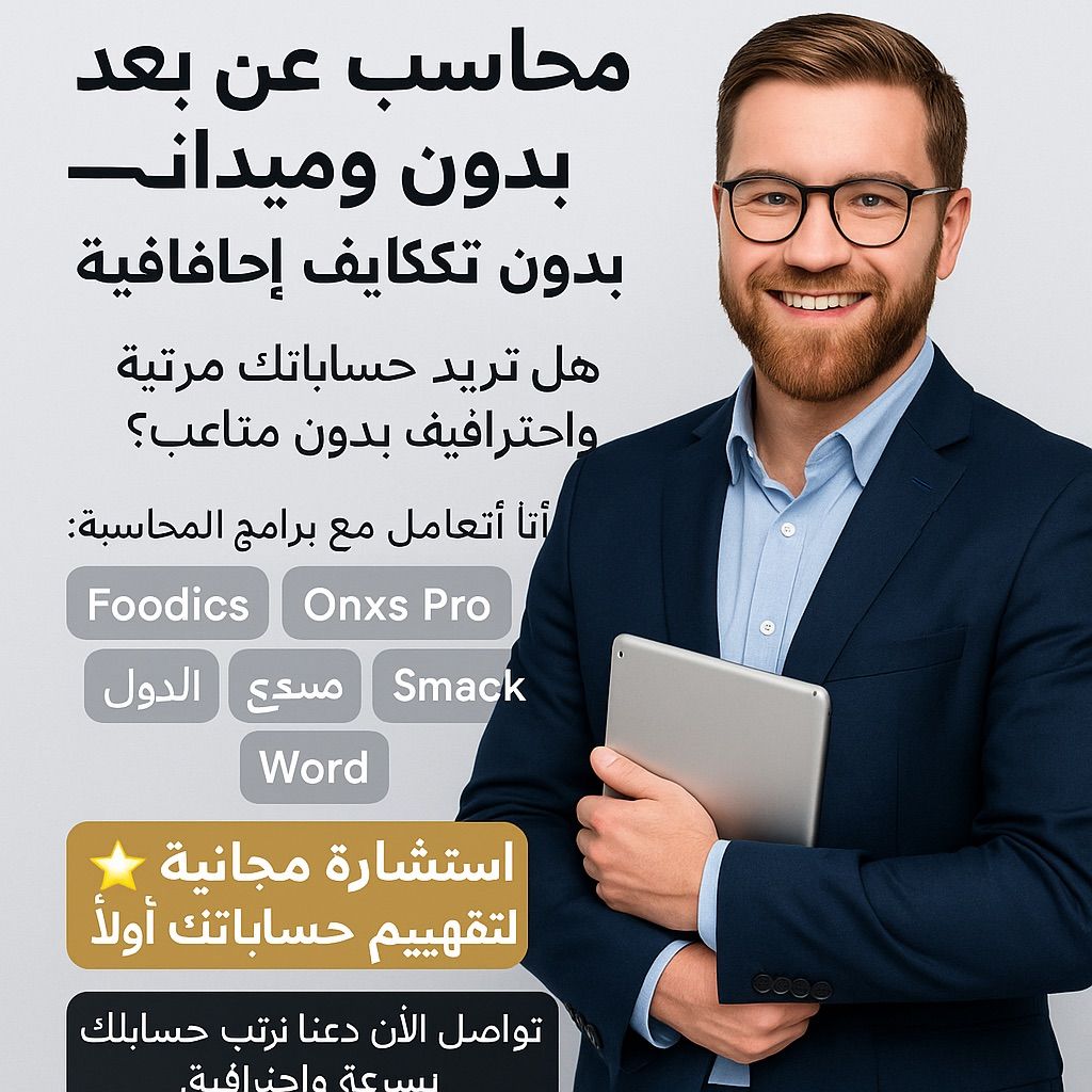 محاسب عن بعد وميداني بدون تكاليف اضافية هل تريد حساباتك مرتبة واحترافية بدون متاعب أنا أتعامل مع جميع برامج المحاسبة فودكس، أونكس برو، الوعلأن، سهل، سماك، Excel، Word، وأقدم خدمات عن بعد أو زيارات ميدانية عند الحاجة. استشارة مجانية لتقييم حساباتك أولا تواصل الآن ودعنا نرتب حساباتك بسرعة واحترافية