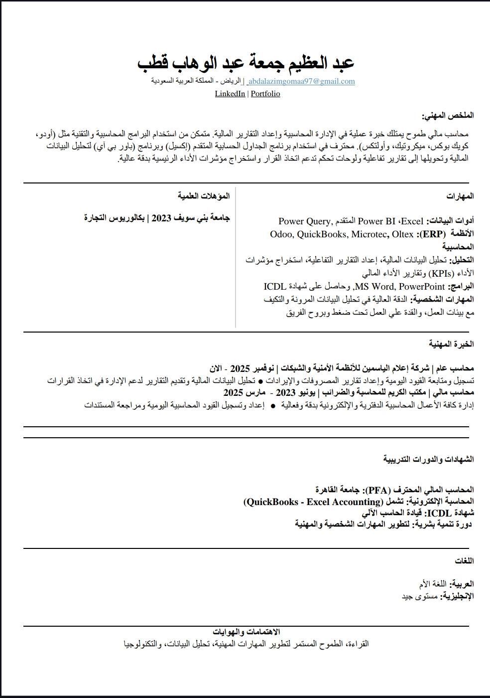 محاسب متمكن بخبرة عملية تزيد عن سنة ونصف في مجال المحاسبة، تشمل اعداد القيود اليومية، اعداد التقارير المالية، وإدارة الحسابات باستخدام أنظمة محاسبية متنوعة. امتلك مهارات قوية في استخدام Excel وOdoo ERP وPower BI وZoho Books وMicrotec وOLTEX، مع القدرة على اعداد التقارير المالية بدقة والمساهمة في تحسين كفاءة العمليات المحاسبية