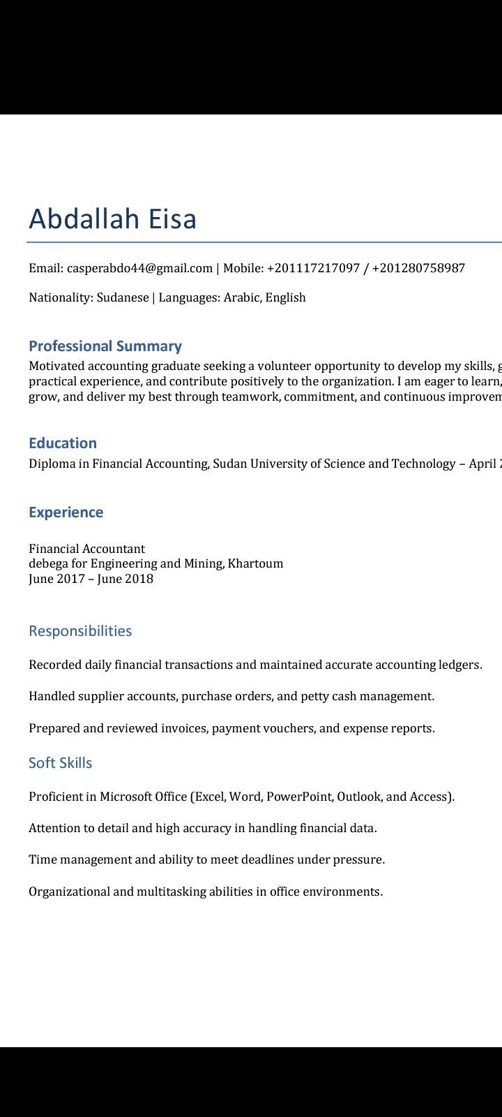 باحث عن عمل محاسب مالي خبرة سنة في المحاسبة والتدقيق وتسجيل القيود اليومية واعداد الفواتير والتقارير المالية ولدي خبرة كافية في برامج المحاسبة اكسل وكويك بوكس وسماك وERB دفترة متوسط في اللغة الانجليزية