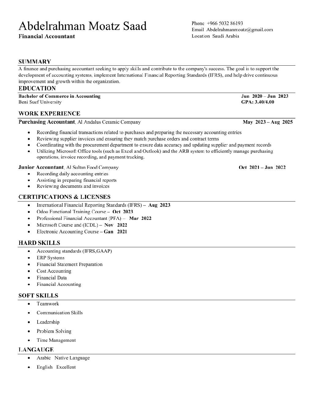 محاسب لدي خبرة ومهارات في اعداد التقارير وعمل قيود يومية وكافة الجوانب المحاسبية والعمل بالقونين والمبادئ العالمية للمحاسبة أل IFRS واستخدام برامج Erp