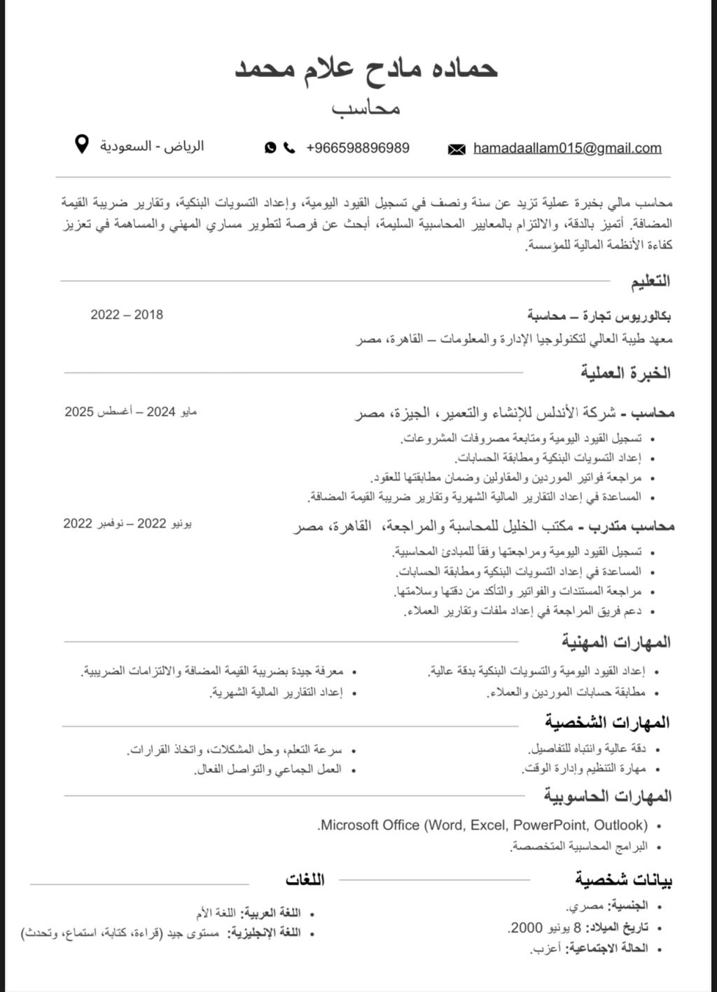 يشرفني التقدم لوظيفة محاسب في شركة كم الموقرة. امتلك خبرة في اعداد القيود اليومية، والتسويات البنكية، ومتابعة الحسابات، واعداد التقارير المالية الشهرية. أتطلع لأن أكون جزءا من فريقكم