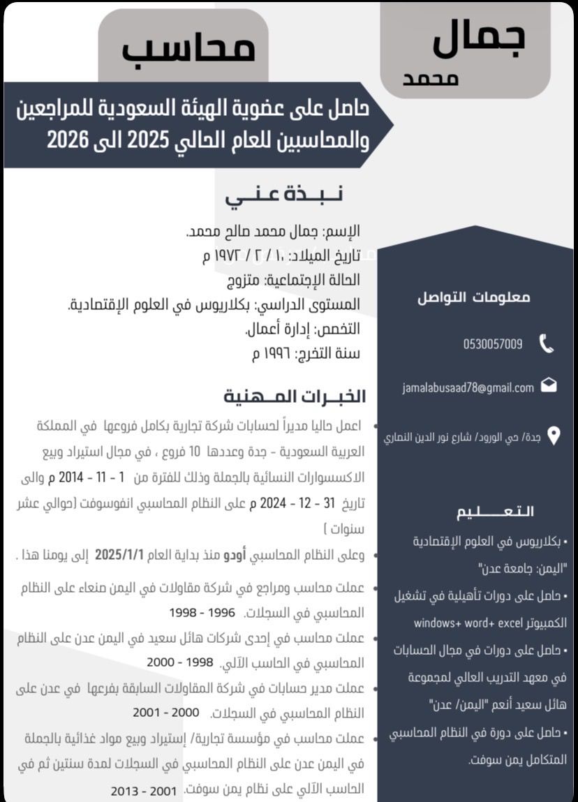 محاسب خبرة في مجال الحسابات أكثر من 20 سنة اشتغلت مدير حسابات في شركة لأكثر من 10 سنوات ملم بالحسابات - اعداد التقارير المحاسبية. اعداد وتقديم الاقرار لضريبة القيمة المضافة. اعداد القوائم المالية السنوية. ردود على الاستفسار لضريبة القيمة المضافة. عمل قيود يومية. وغيرها من المهام المحاسبية حاليا اشتغل مدير حسابات في أحد الشركات لكن ابحث عن فرصة عمل أحسن