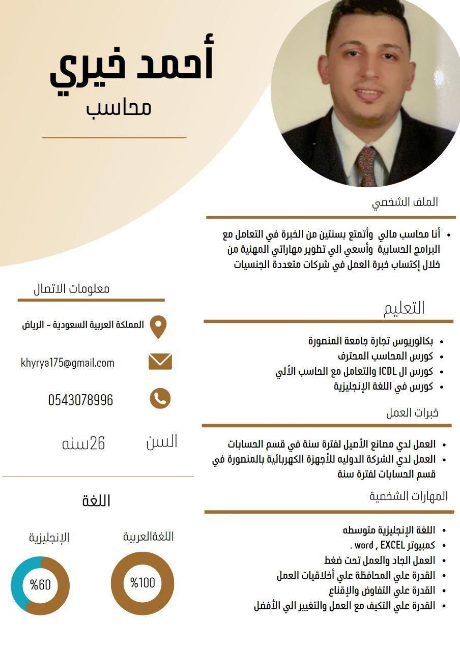 أنا أحمد الجنسية مصري بكالوريوس محاسبه خبرة سنتين في محاسبه ولديه رخصة قيادة سعوديه العمر 27