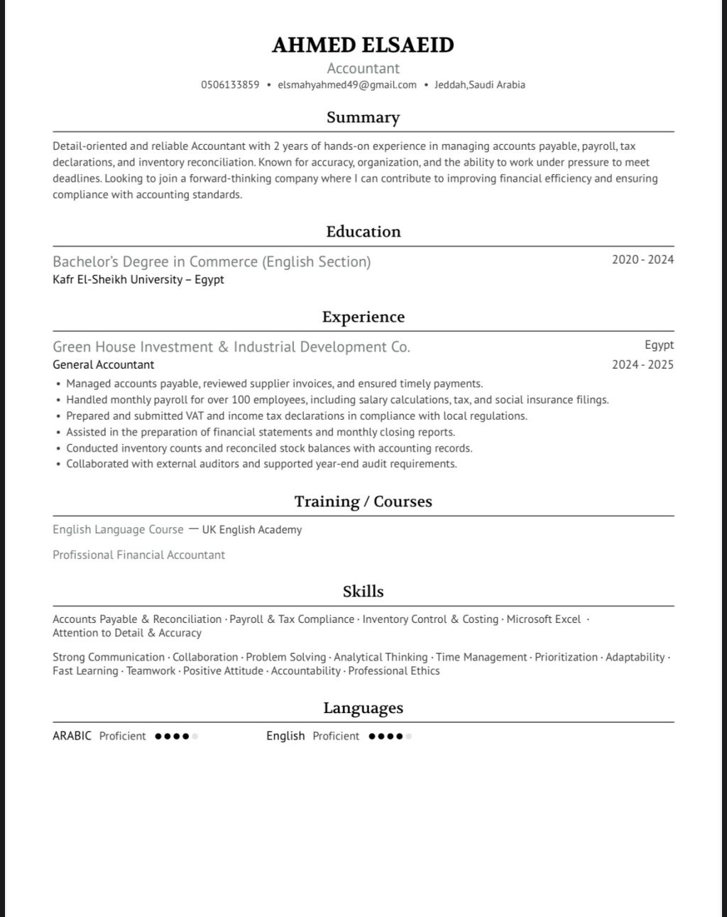 ابحث عن فرصة عمل كمحاسب في شركة أو مؤسسة مرموقة، حيث أسعى لتوظيف خبراتي ومهاراتي في الإدارة المالية والمحاسبية لتحقيق أفضل النتائج. امتلك خبرة سنة ونصف في التسجيل اليومي للعمليات المالية إجراء المطابقات البنكية ومطابقات العملاء والموردين اعداد القوائم المالية (المركز المالي وقائمة الدخل) اعداد مرتبات الموظفين وحساب ضريبة القيمة المضافة والزكاة