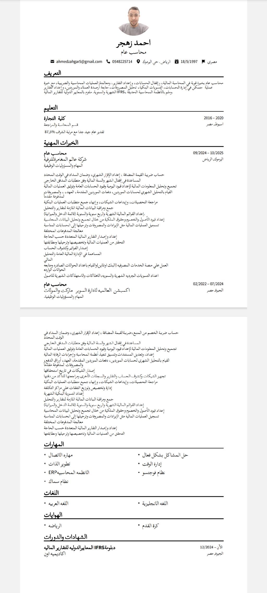 محاسب عام خبرة أربع سنوات في الحسابات العامة والضرائب خبرة في التقفيلات الشهرية والسنوية التسويات الجردية ومذكرة تسوية البنك الاقرار الضريبي لضريبة القيمة المضافة العمل علي حسابات العملاء والموردين القوائم المالية وفقا لمعايير الدولية التعامل مع تطبيقات التسويق الالكتروني (سلة - ذا شيفز) التعامل مع منصات البنك اونلاين وتنفيذ الحوالات المحلية والدولية متواجد حاليا في الرياض