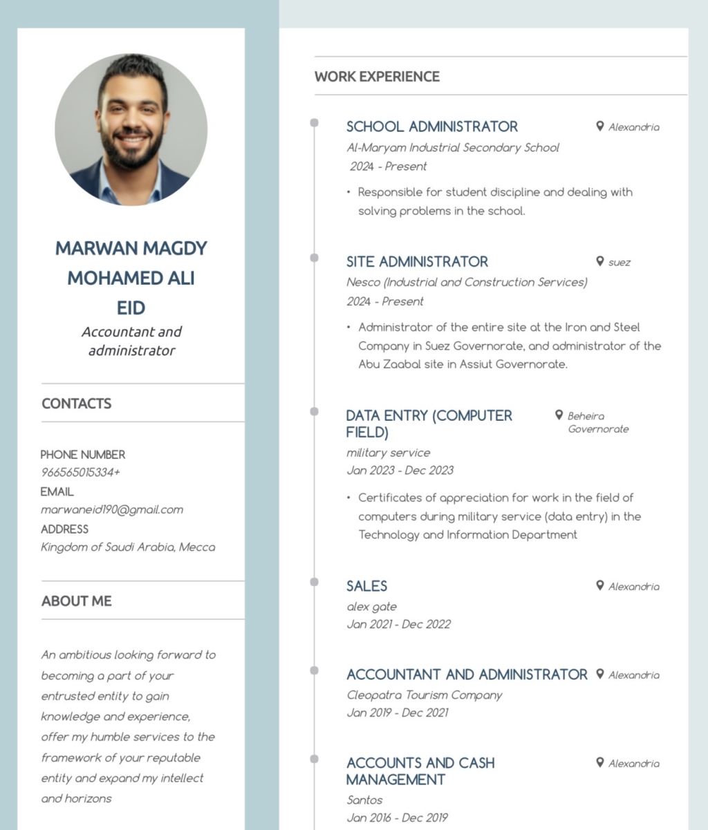محاسب واداري عمري 27 سنة اعمل حاليا في مؤسسة نقل لخدمة الحجاج والمعتمرين وأجيد التعامل علي منصات قوي وتم ومقيم وإيفاء لجميع المخالفات ومسؤول مسئولية كاملة عن المؤسسة من كل شيء