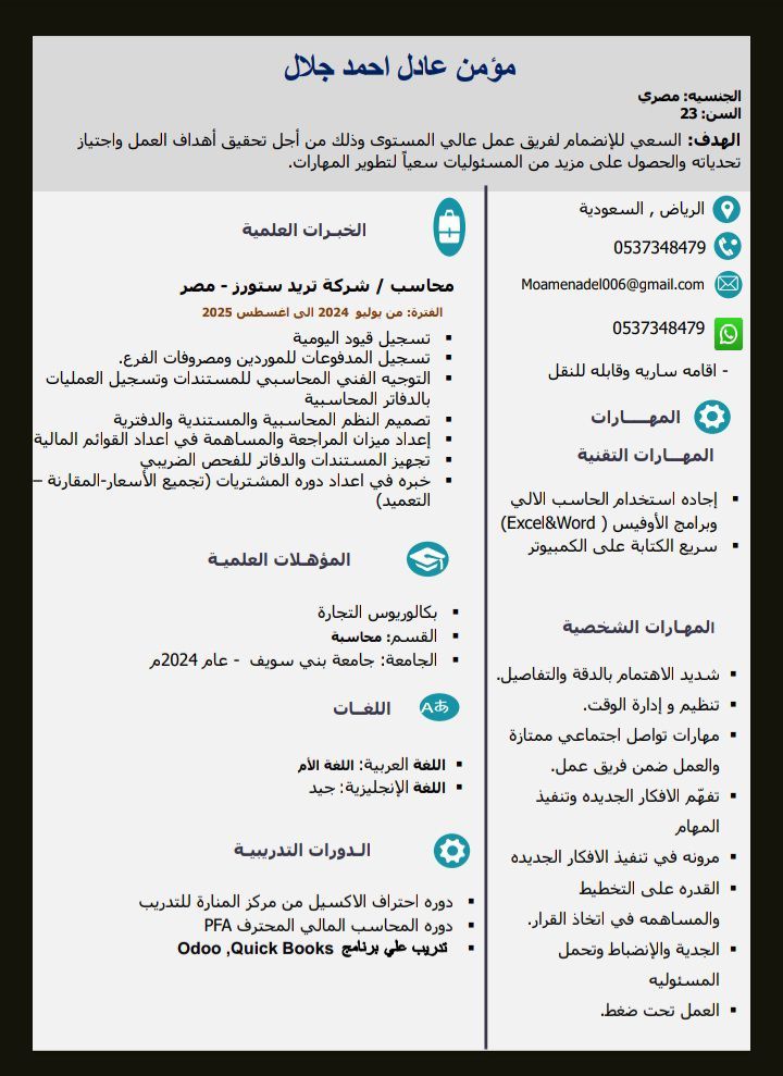 محاسب يبحث عن عمل خبرة سنة علي دراية بكافة المعاملات المحاسبية وعمل قيود المبيعات والمشتريات ومتابعه العملاء والموردين والتعامل مباشر معهم وعمل التسويات ومطبقة أرصدة البنك وعمل التقرير المحاسبية خبرة علي برنامج Quickbooks وOdoo وخبر ممتازة في التعامل مع برامج الأوفيس والأكسيل متواجد في الرياض إقامة سارية قابلة للنقل وامكانية العمل في أي مكان داخل المملكة