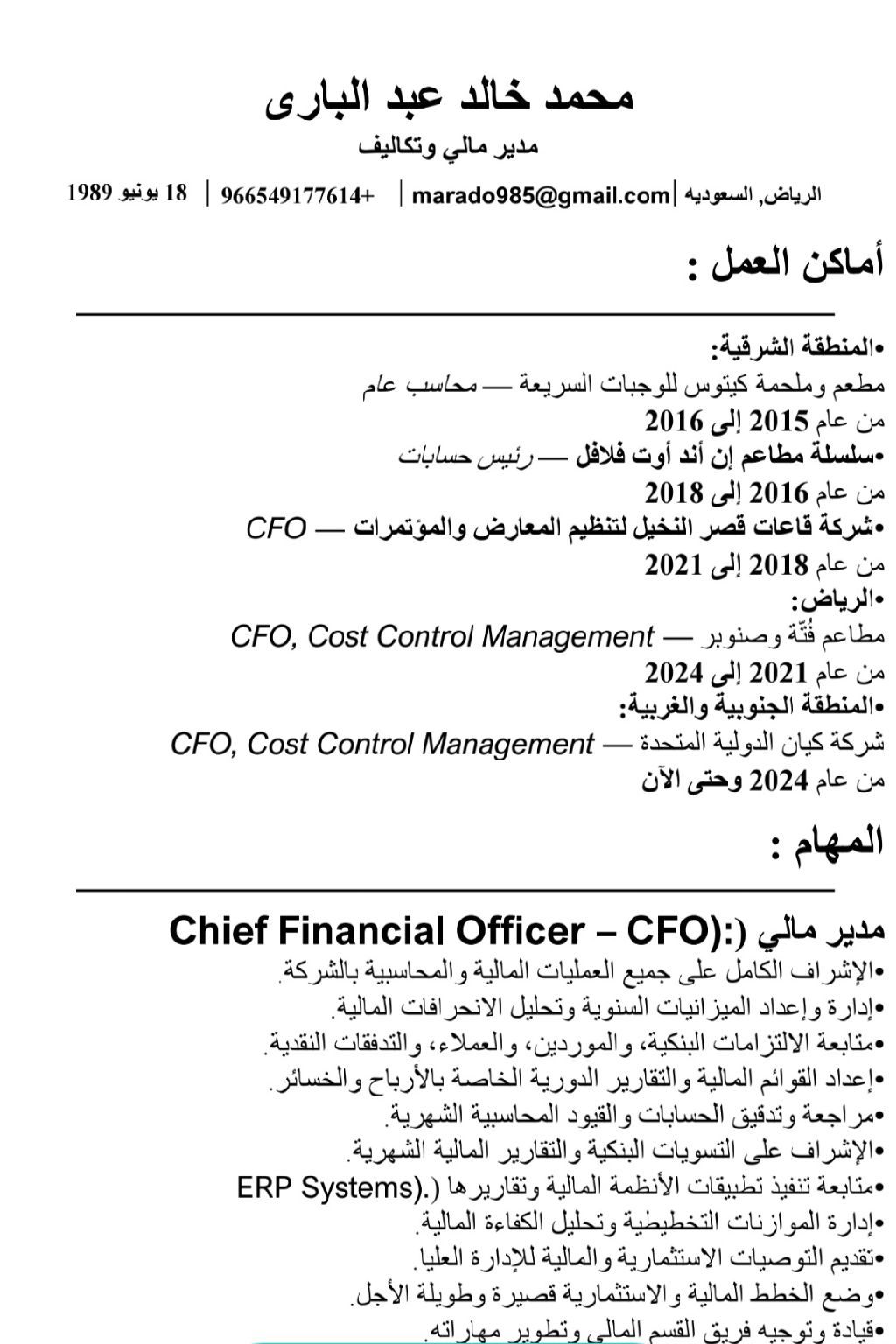 أنا مدير مالي ورئيس لقسم التكاليف اشتغلت مطاعم وكافيهات وملاحم 10 سنوات اسوي دراسات وتحليلات وتقارير استراتيجية مهمه والقوائم والميزانيات والضرائب والأرباح والخساير وحقوق الملكية والسيولة النقدية واعمار الديون والمشتريات والمخزون ومراقبة التكاليف ومؤشرات الأداء والموازنة التقديرية والتخطيطية والمخاطر والتمويلات وتقارير الربحية ومعدلات دوران المخزون ورأس المال وتحليل القوائم الشامل الافقي والرأسي