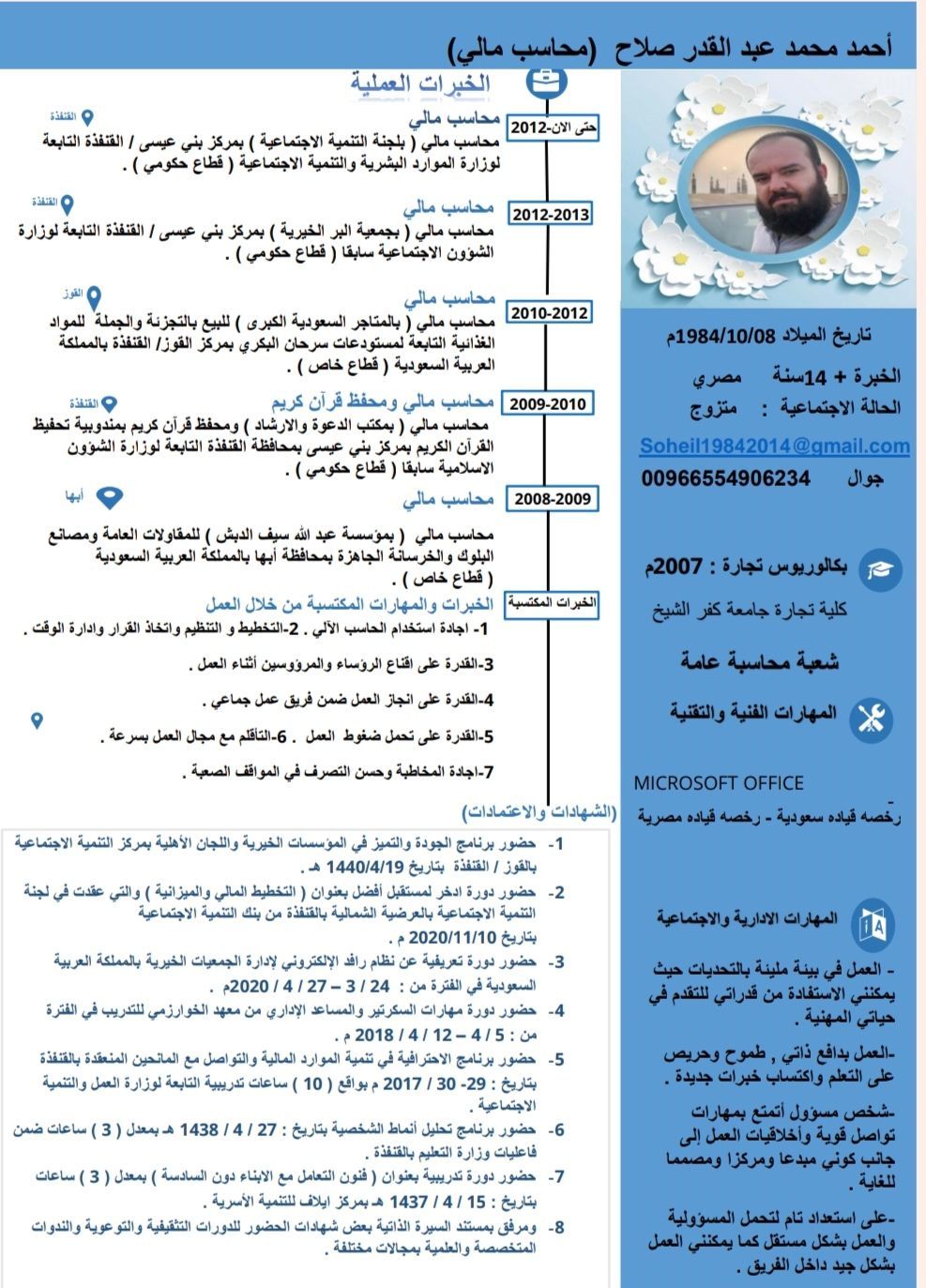 أقدم بين أيديكم بعض من خبراتي المهنية في المجال المالي والاداري مرفقه بالسيرة الذاتية وبعض من شهادات الخبرة. عملت 15 سنة في القطاع غير الربحي للجمعيات الخيرية والتنمية الاجتماعية ومكاتب الدعوة والارشاد وجمعية التحفيظ بمحافظة القنفذة / مركز ثلاثاء الخرم بني عيسى