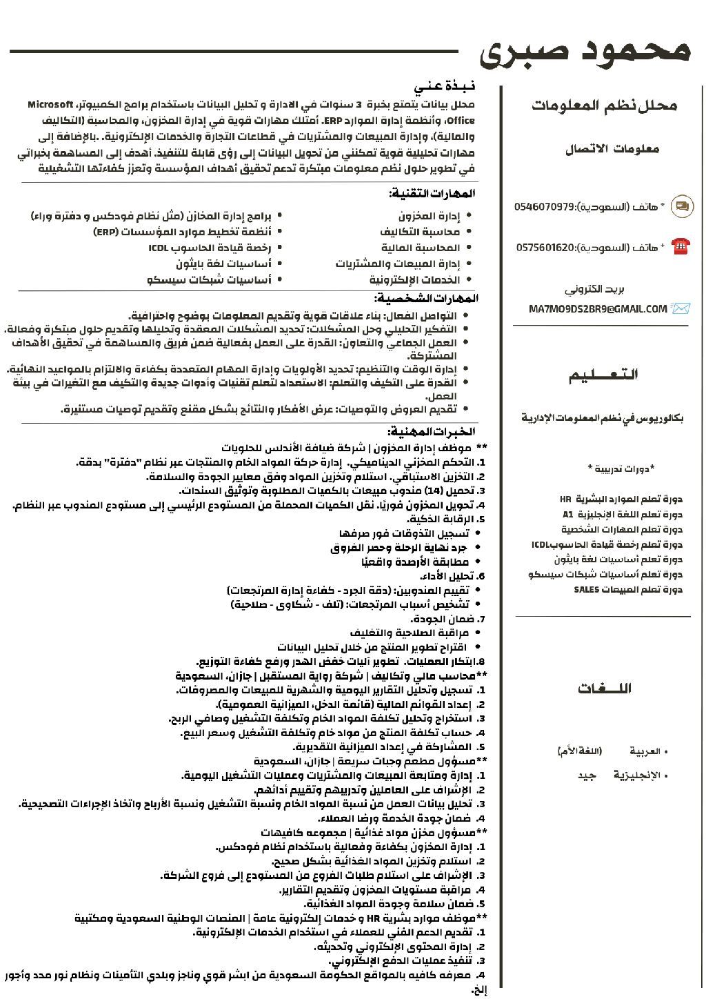 أنا شاب مصري طموح ابحث عن فرصة عمل تناسب خبرتي في المحاسبة المالية وإدارة التكاليف تحليل البيانات لتحسين الربحية ومراقبة التدفقات وإدارة المخزون وتنظيم الجرد وموظف موارد بشرية والخدمات العامة في كل ما يخص مسير الرواتب وانشاء عقود العمل الخ. أتميز بالدقة والالتزام بالمواعيد وقدرة على العمل الجماعي مع حرصي على تطوير مهاراتي باستمرار أطمح بيئة عمل حضارية تسعي للتطوير النمو
