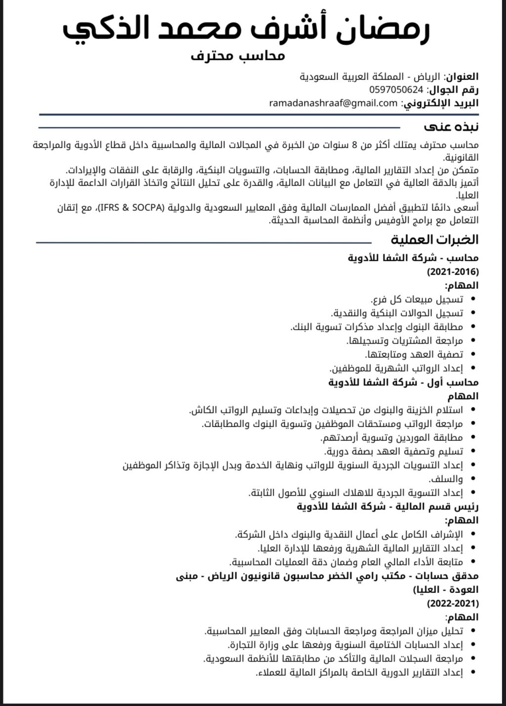 محاسب مصري ابحث عن عمل خبرة 9 سنوات المهنة في الإقامة محاسب مسجل لدي الهيئة العامة للمحاسبين أجيد التعامل مع البرامج المحاسبية مقيم بالمملكة العربية السعودية ومتاح للعمل في أي مكان داخل المملكة ولدي رخصة قيادة