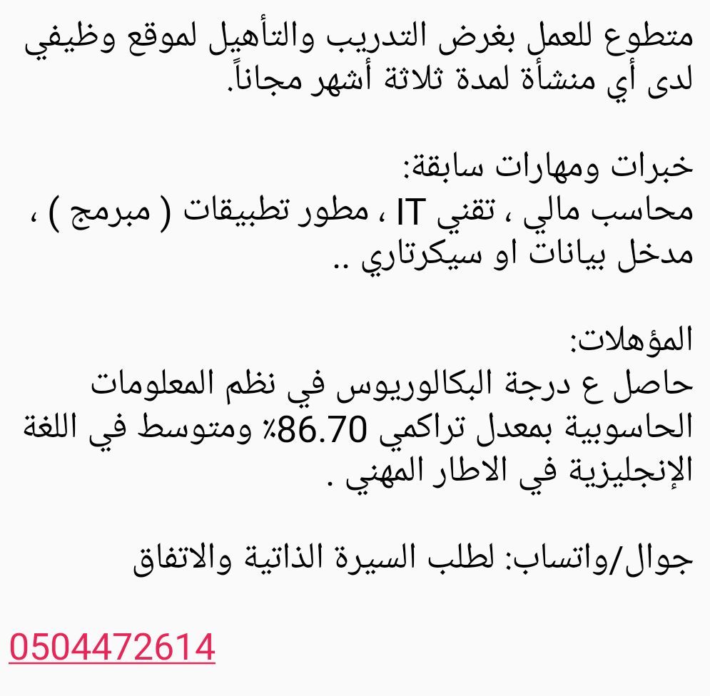 متطوع للعمل بغرض التدريب والتأهيل لموقع وظيفي لدى أي منشأة لمدة ثلاثة أشهر مجانا. ومتواجد حاليا في الرياض خبرات ومهارات سابقة محاسب مالي، تقني IT، مطور تطبيقات (مبرمج) مدخل بيانات أو سيكرتاري. المؤهلات حاصل ع درجة البكالوريوس في نظم المعلومات الحاسوبية بمعدل تراكمي 86.70 ومتوسط في اللغة الانجليزية في الاطار المهني. جوال / واتساب لطلب السيرة الذاتية والاتفاق