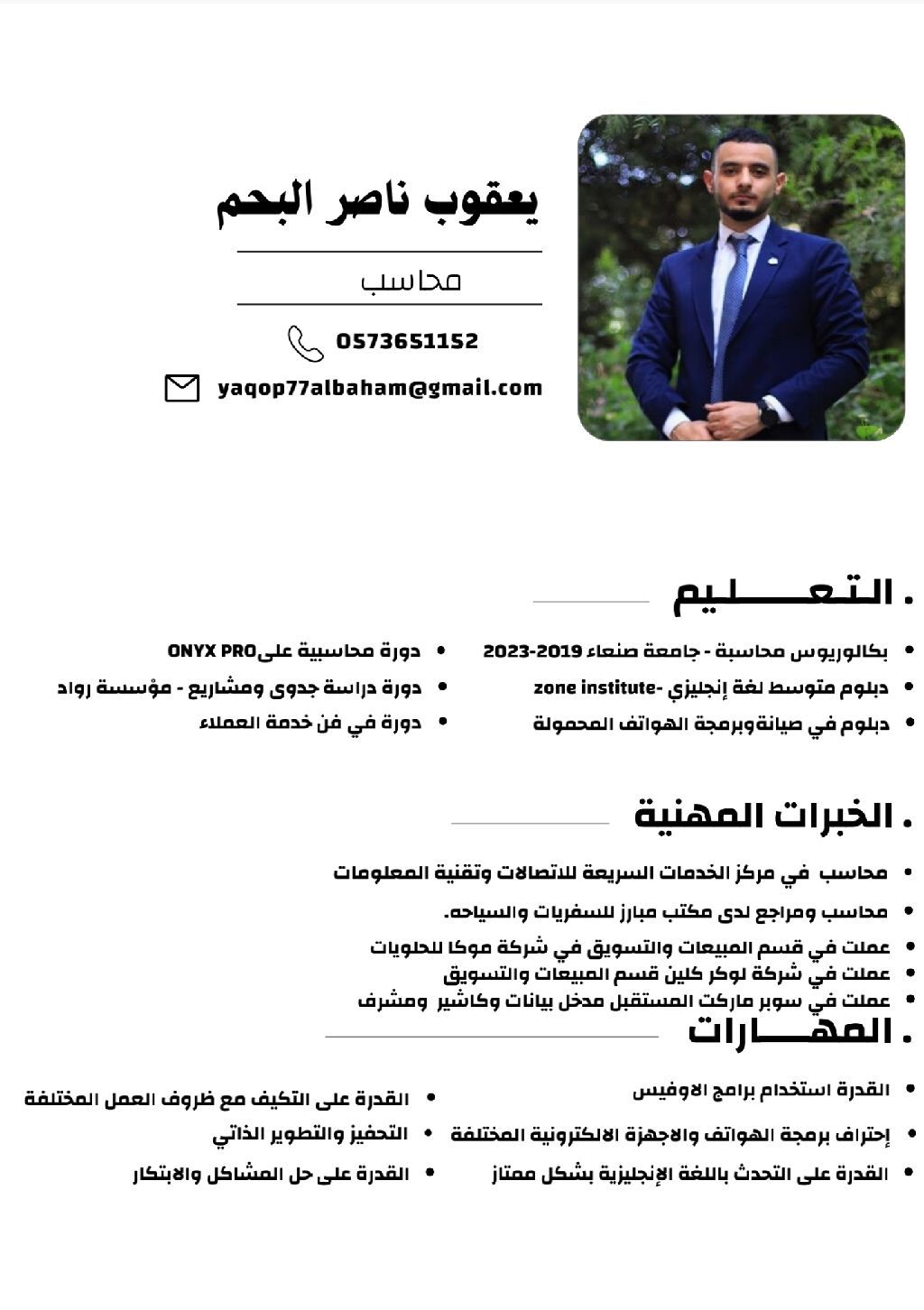 محاسب مالي يتمتع بخبرة عملية تزيد عن سنتين في مجال المحاسبة وإدارة البيانات المالية. امتلك خبرة قوية في تطبيق المبادئ المحاسبية، واستخدام الأنظمة السحابية، وحزمة Microsoft Office بكفاءة عالية. لدي سجل عملي في إدارة العمليات اليومية، ومتابعة الفواتير، والرقابة على المخزون أطمح للانضمام الى بيئة عمل متطورة تتيح لي توظيف مهاراتي لتعزيز الكفاءة المالية وتحقيق أهداف المنشأة