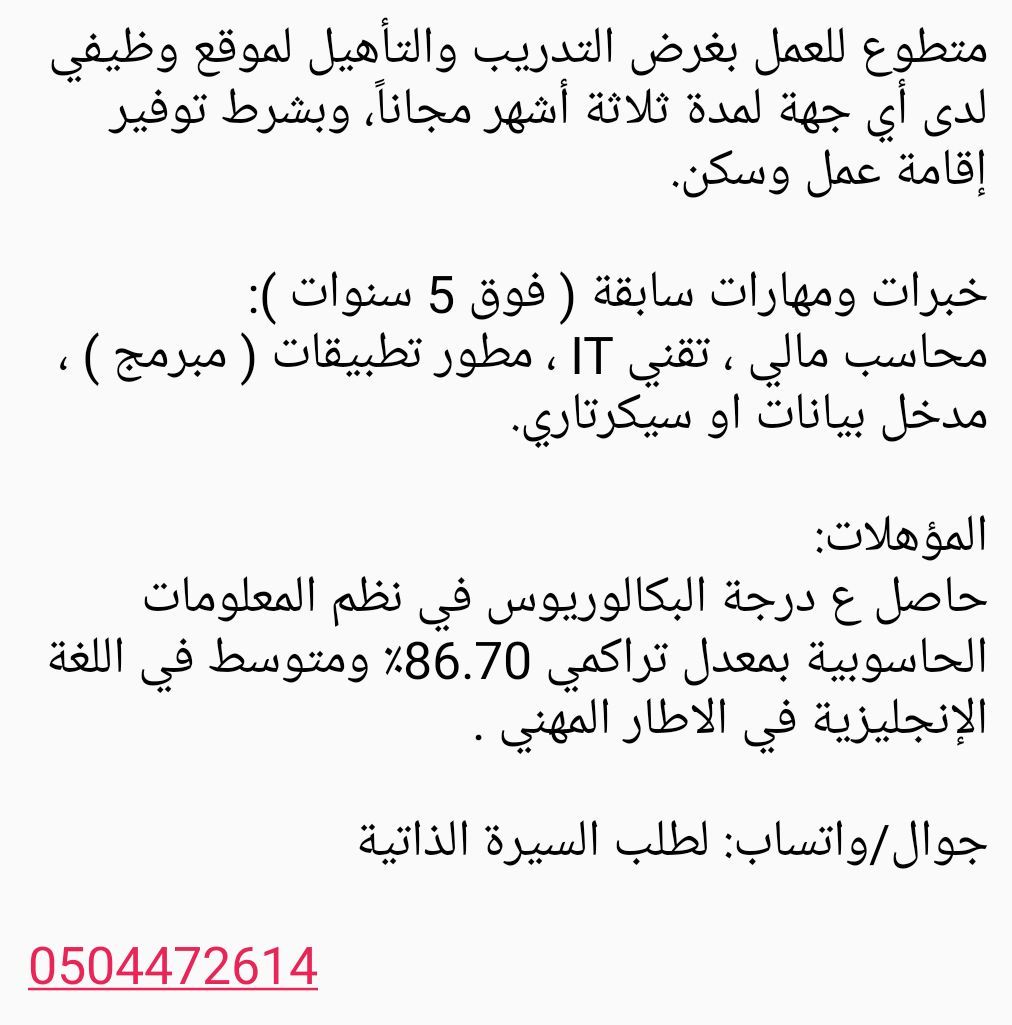 متطوع للعمل بغرض التدريب والتأهيل لموقع وظيفي لدى أي جهة لمدة ثلاثة أشهر مجانا، وبشرط توفير إقامة عمل وسكن. خبرات ومهارات سابقة (فوق 5 سنوات) محاسب مالي، تقني IT، مطور تطبيقات (مبرمج) مدخل بيانات أو سيكرتاري. المؤهلات حاصل ع درجة البكالوريوس في نظم المعلومات الحاسوبية بمعدل تراكمي 86.70 ومتوسط في اللغة الانجليزية في الاطار المهني. جوال / واتساب لطلب السيرة الذاتية