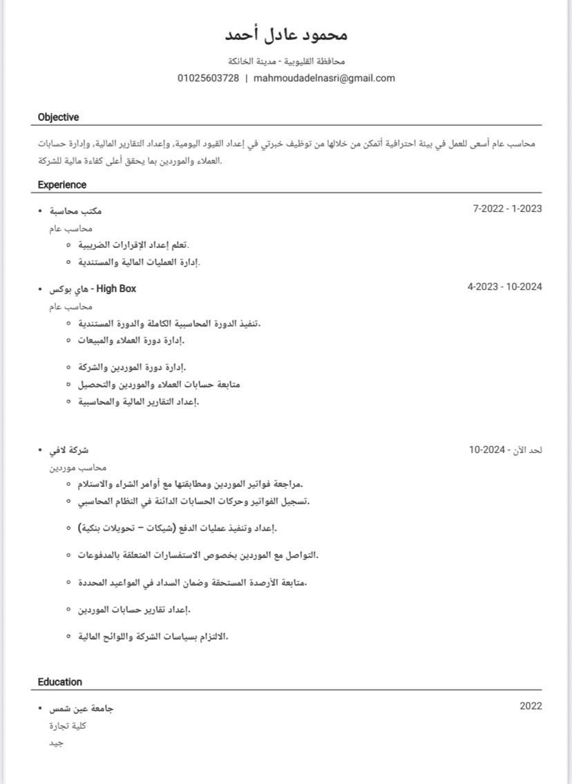 محاسب عام ذو خبرة عملية في مكاتب المحاسبة والشركات التجارية عملت على تنفيذ الدورة المحاسبية الكاملة واعداد التقارير المالية ومتابعة حسابات الموردين والعملاء والأرباح والخسائر والميزانية العموميه والاقرارات الضريبية وابحث عن فرصة مناسبة لدى جهة احترافية داخل المملكة