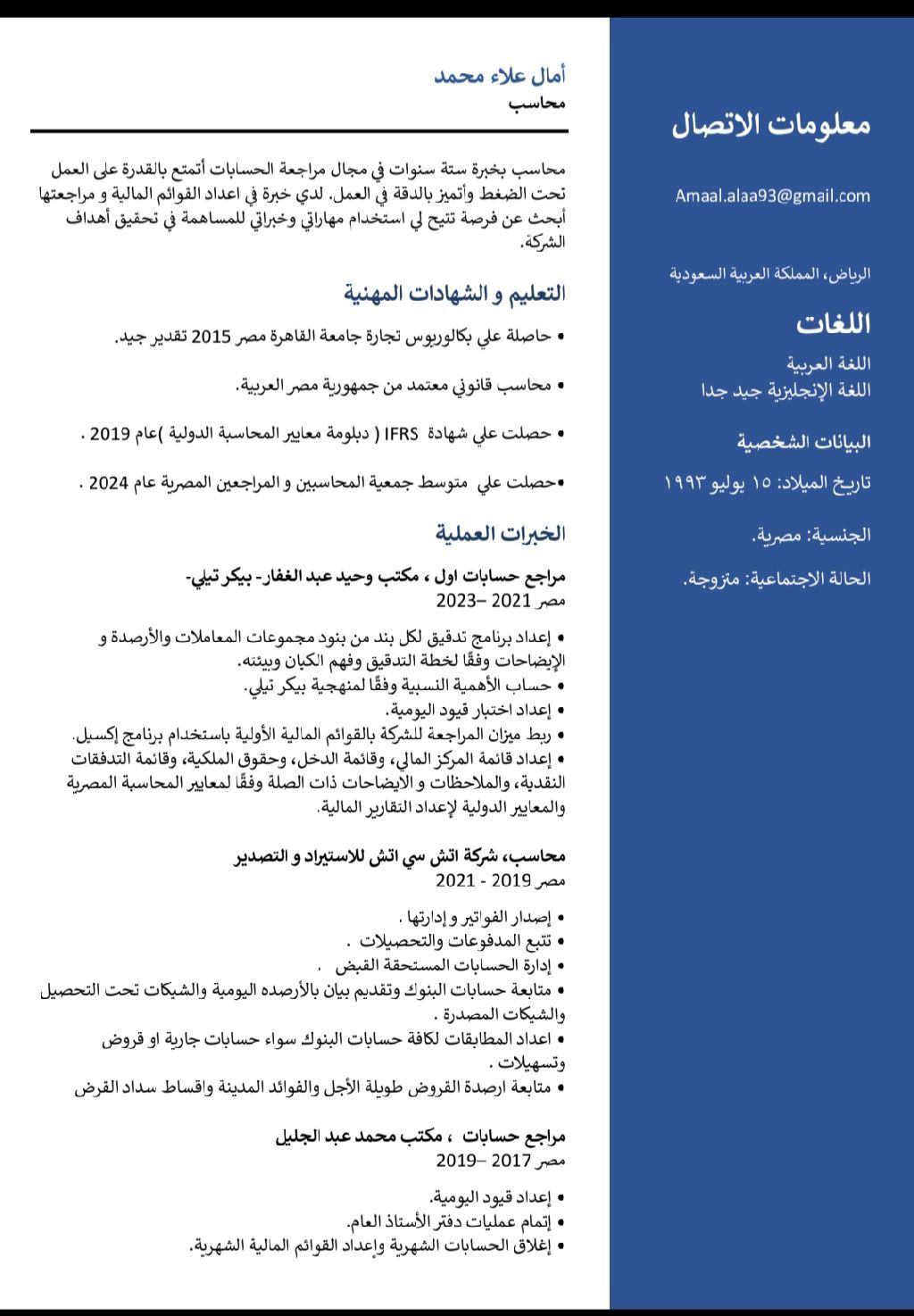 السادة الكرام، تحية طيبة وبعد، أرغب في التقدم لوظيفة محاسبة عن بعد، لدي خبرة 6 سنوات في مجال الحسابات، وحاصلة على دبلومة IFRS وشهادة متوسط جمعية المحاسبين والمراجعين المصرية. مقيمة في الرياض - مصرية الجنسية، وعلى استعداد للانضمام فورا. وتفضلوا بقبول خالص التقدير