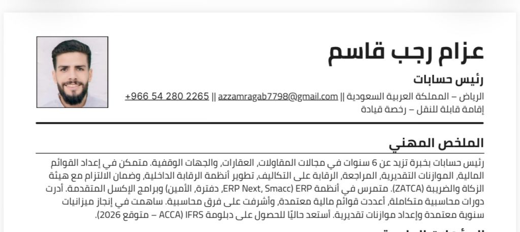 محاسب محترف بخبرة تزيد عن 6 سنوات في مسك الدفاتر، تنظيم ومتابعة الحسابات، مراجعة القيود والتسويات المحاسبية، والالتزام بضريبة القيمة المضافة (VAT) مع خبرة عملية في العمل على أنظمة ERP وتنظيم الدورة المحاسبية. خبرة بقطاعات متعددة مثل العقارات والمقاولات والخدمات. ملتزم بدراسة وتطبيق معايير المحاسبة الدولية (IFRS) والتطوير المستمر