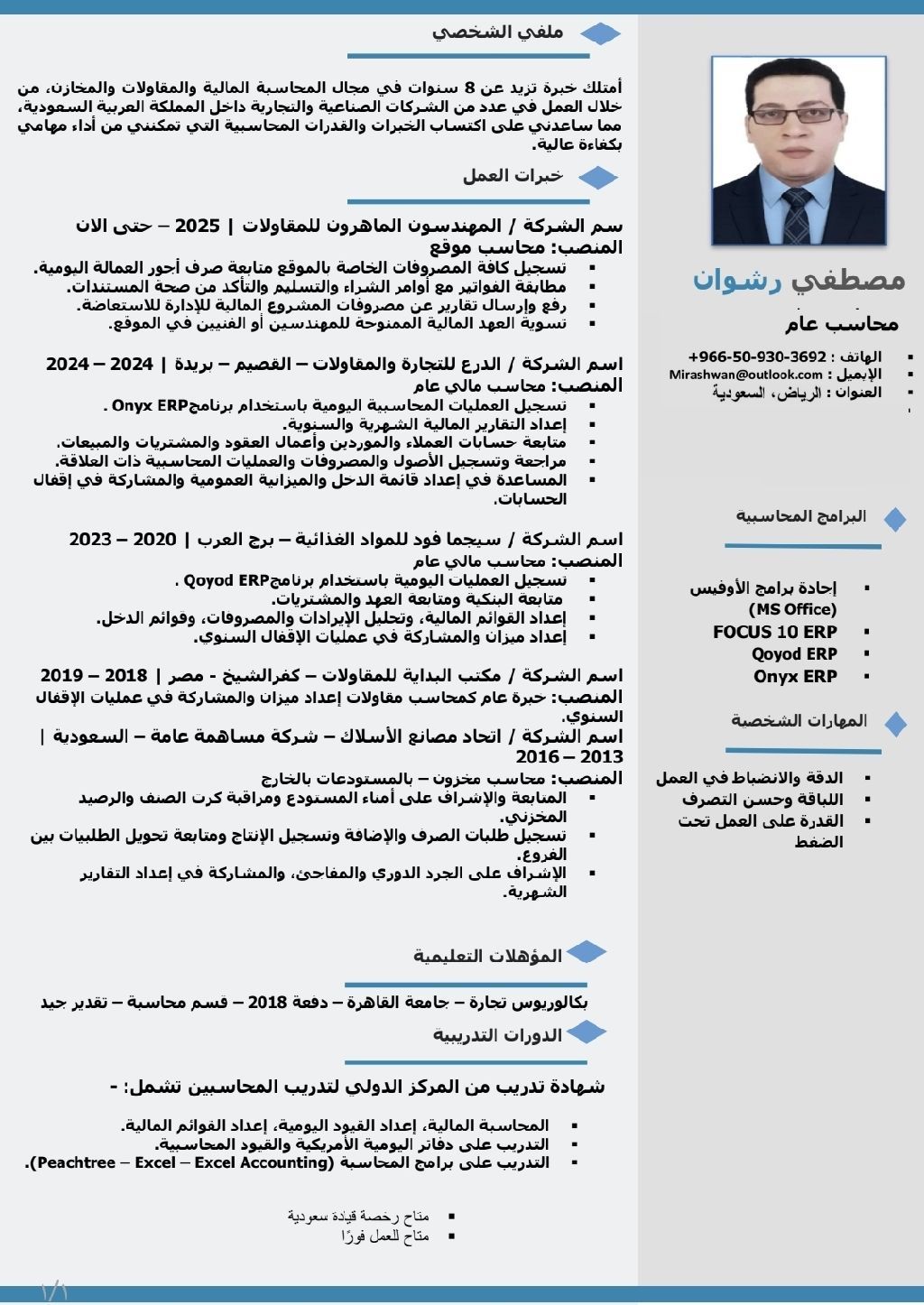 محاسب عام لدي خبرة في الشركات (تجارية، صناعية، مقاولات، مخازن) متواجد في الرياض ابحث عن عمل مباشرة العمل فورا الإقامة سارية حتى 14 مايو 2026 / ليس على رأس العمل حاليا