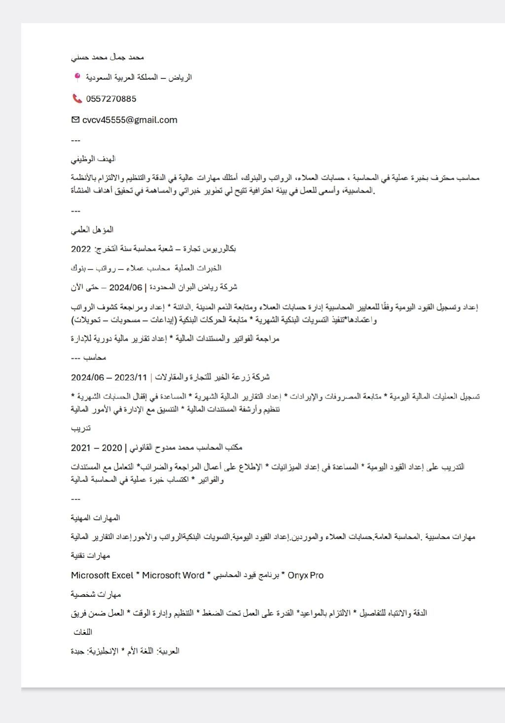 محاسب عملاء. رواتب. موردين. ادخال قيود خبرة 2 سنة داخل المملكة