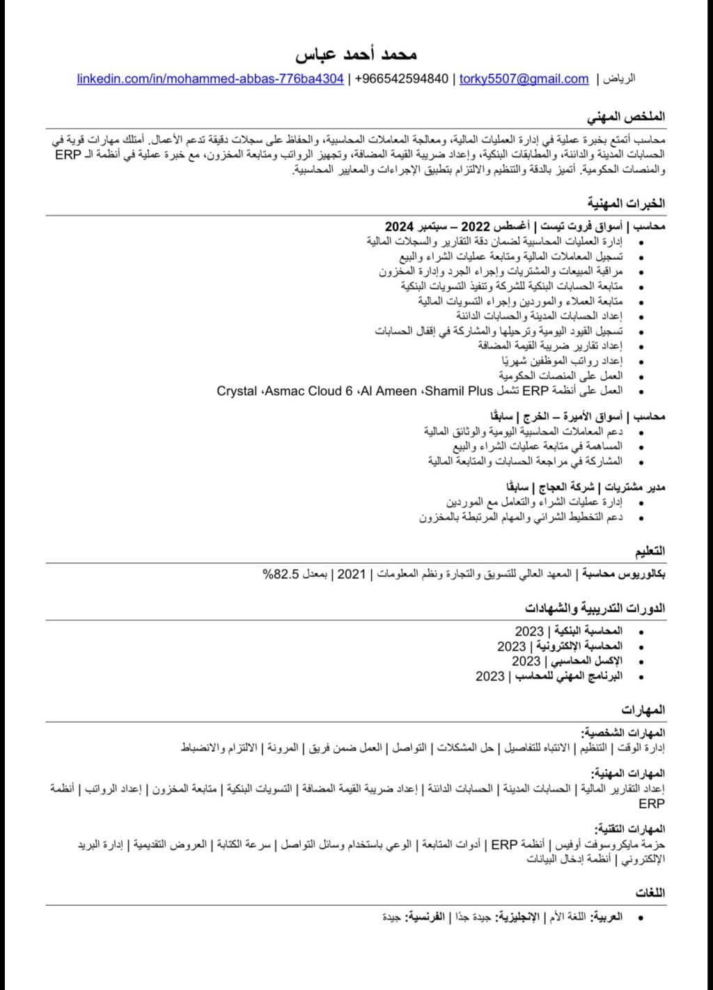 محاسب أتمتع بخبرة عملية في إدارة العمليات المالية، ومعالجة المعاملات المحاسبية، والحفاظ على سجلات دقيقة تدعم الأعمال. امتلك مهارات قوية في الحسابات المدينة والدائنة، والمطابقات البنكية، واعداد ضريبة القيمة المضافة، وتجهيز الرواتب ومتابعة المخزون، مع خبرة عملية في أنظمة أل ERP والمنصات الحكومية. أتميز بالدقة والتنظيم والالتزام بتطبيق الاجراءات والمعايير المحاسبية