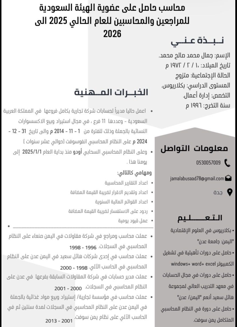 محاسب خبرة في مجال الحسابات أكثر من 20 سنة اشتغلت مدير حسابات في شركة لأكثر من 10 سنوات ملم بالحسابات - اعداد التقارير المحاسبية. اعداد وتقديم الاقرار لضريبة القيمة المضافة. اعداد القوائم المالية السنوية. ردود على الاستفسار لضريبة القيمة المضافة. عمل قيود يومية. وغيرها من المهام المحاسبية