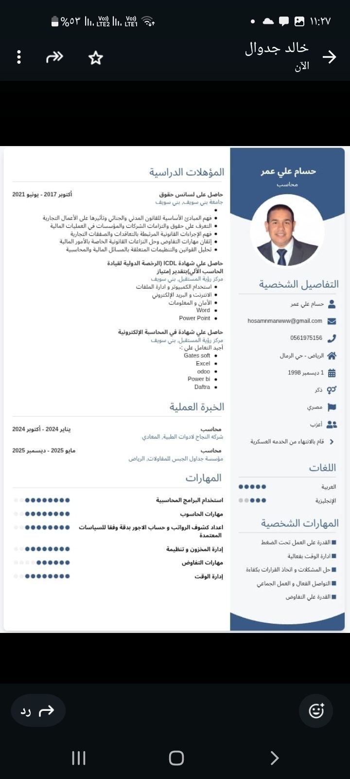 محاسب محترف لديه خبرة عملية في مجال المحاسبة داخل المملكة العربية السعودية، وعمل سابقا في مؤسسة جداول الجبس للمقاولات. متمكن من استخدام برامج المحاسبة ERP مثل (أموال - أبيكس) لديه خبرة في ضريبة القيمة المضافة واعداد ورفع الاقرارات الضريبية، وادخال القيود اليومية، ومتابعة حسابات العملاء والموردين، واعداد سندات الصرف والقبض، وإدارة العهد. جاهز للعمل فورا، ومتاح لنقل الكفالة