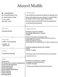 ابحث عن وظيفة خبرة 3 سنين بمجال المطاعم ملم بنظام فودكس المحاسبي استلام وتسليم الطلبات من المطبخ وتسليمها تجهيز وتسليم الطلبات الخارجية مع ضمان جودتها وضمان رحلة وتجربة العميل، مصور سيارات ومقاطع قصيرة ومهتم بأي شيء يخص التصوير كالفعاليات والمؤتمرات والحفلات المطاعم والمقاهي الدعاية والاعلان