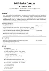 محلل بيانات متخصص ذو خبرة سنتين في تحليل البيانات وتحويل البيانات الأولية والمعقدة الى رؤى عمل قابلة للتنفيذ. امتلك مجموعة مهارات قوية تركز على دورة حياة تحليل البيانات الكاملة، بدءا من استخراج البيانات وتجهيزها وصولا الى التصميم الاحترافي للتقارير ولوحات المتابعة التفاعلية. أستخدم أدوات Power BI, Excel, Python, Sql. امتلك خبرة في مجالات كثيرة مثل إدارة الأعمال والتسويق