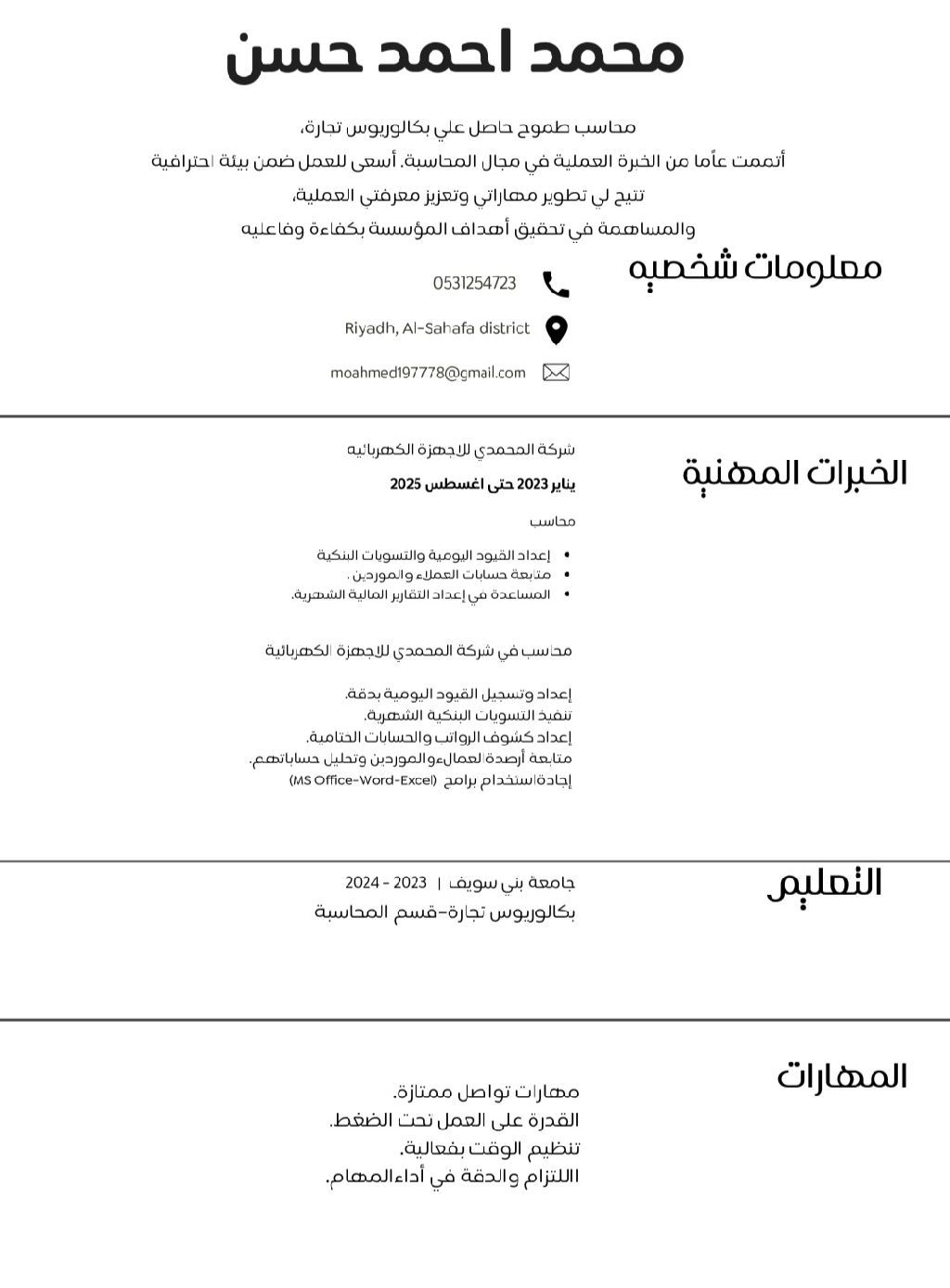 محاسب حديث تخرج بكالوريوس تجارة ابحث عن عمل وظيفة محاسب أجيد استخدام برامج الأوفيس بالكامل خبرة أكثر من سنتين في شركة المحمدي للاجهزة الكهربائية في مصر والآن متواجد في السعودية في الرياض حي الصحافة ومع إقامة قابلة للنقل