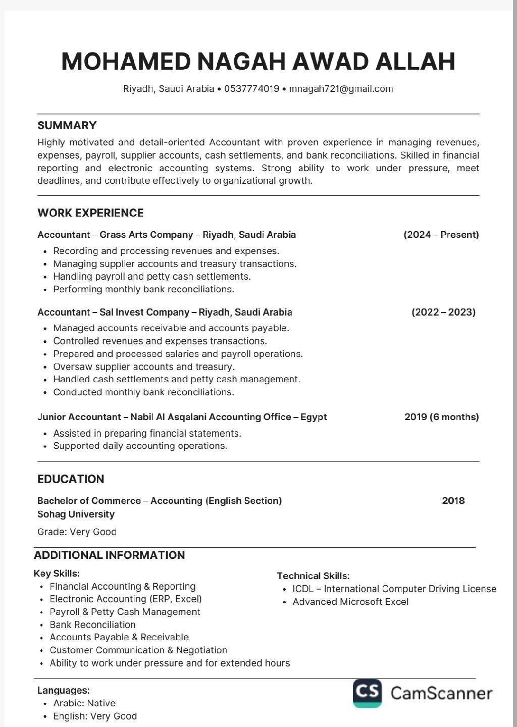 محمد نجاح محاسب بكالوريوس تجارة انجليزي جيد جدا خبرة 4 سنوات كمحاسب ايرادات ومصاريف وموردين وفروع وعملاء ومطابقة بنوك وخزينة وتسوية عهد ورواتب باحث عن فرصة عمل كمحاسب في أي مكان بالمملكة إقامة سارية وقابلة للنقل