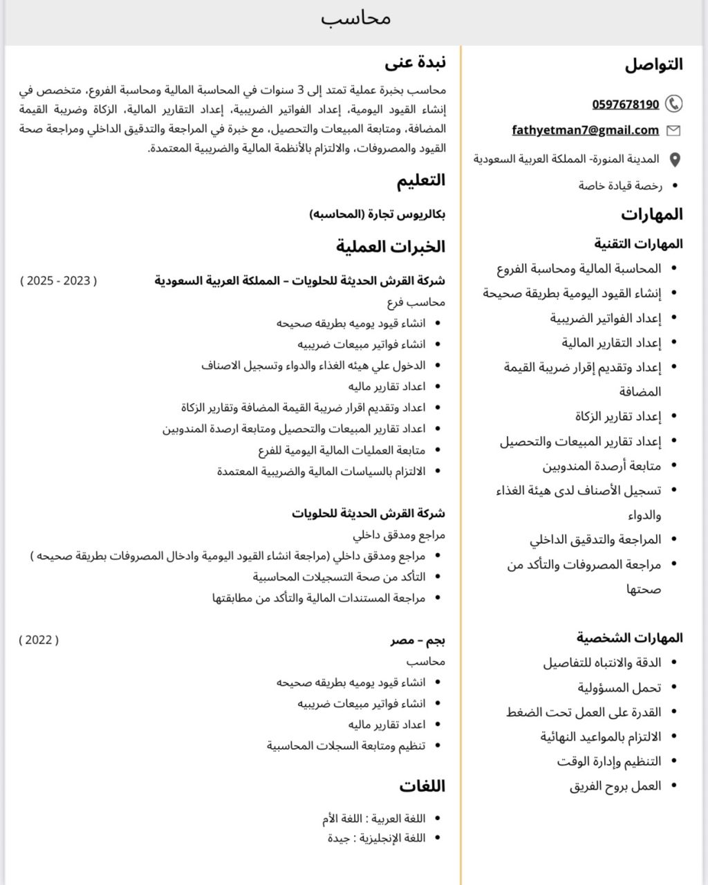 محاسب خبرة 3 سنوات ابحث عن فرصة عمل أجيد تسجيل قيود اليومية والمطابقات البنكية ومطابقة العملاء والموردين واعداد التقارير واعداد الاقرارات الضريبية ورفع الاقرار الضريبي واعداد القوائم المالية واجادة العمل علي البرامج المحاسبية