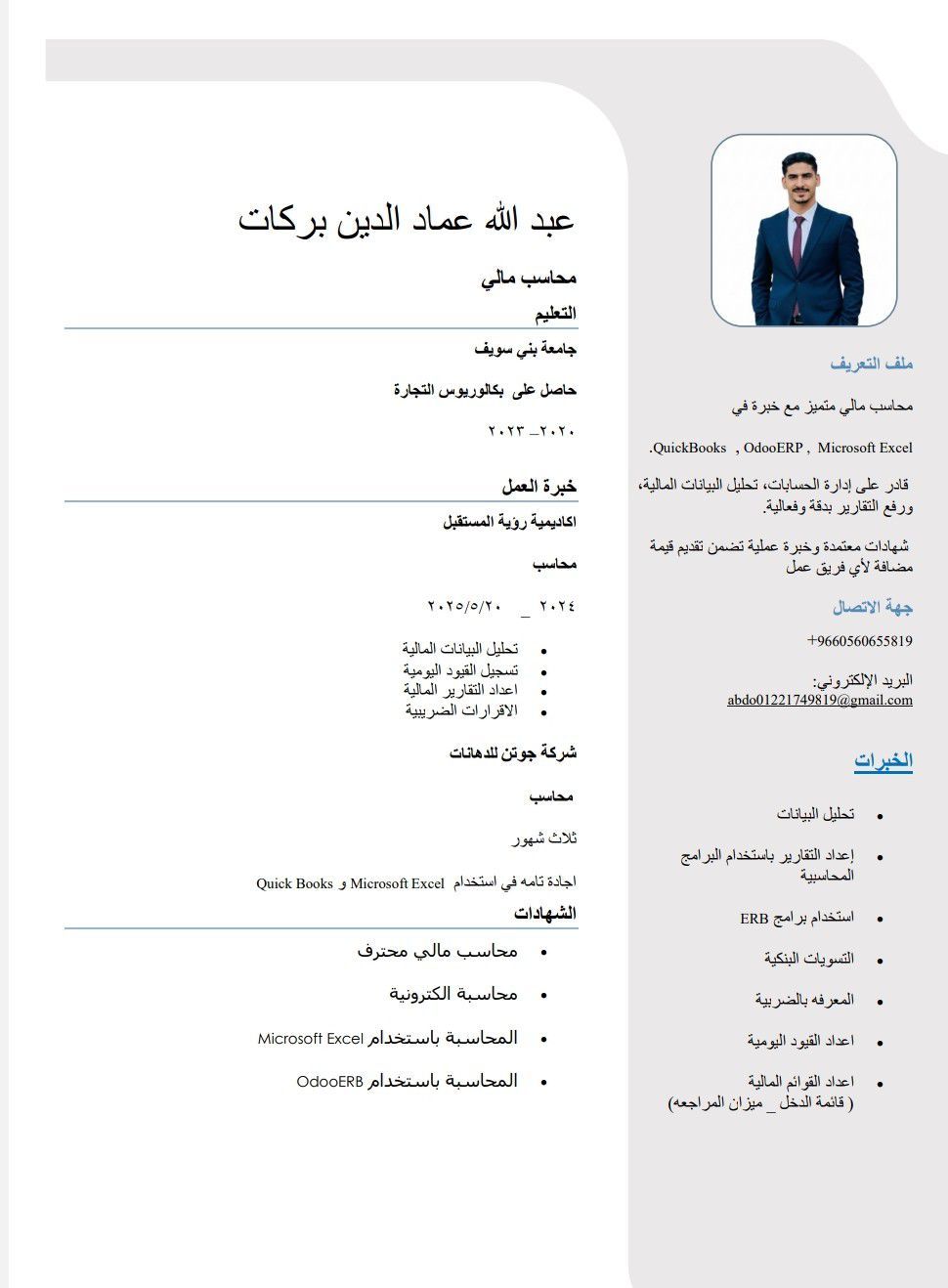 محاسب مالي متميز بخبرة سنة في إدارة الحسابات المالية، التسويات البنكية، اعداد التقارير المالية، والضريبة. متمكن من برامج المحاسبة Odoo وQuickbooks وExcel متقدم. مهارات تحليلية قوية ودقة في العمل. يسعى لتطوير العمليات المالية وتحسين الأداء المالي للشركة